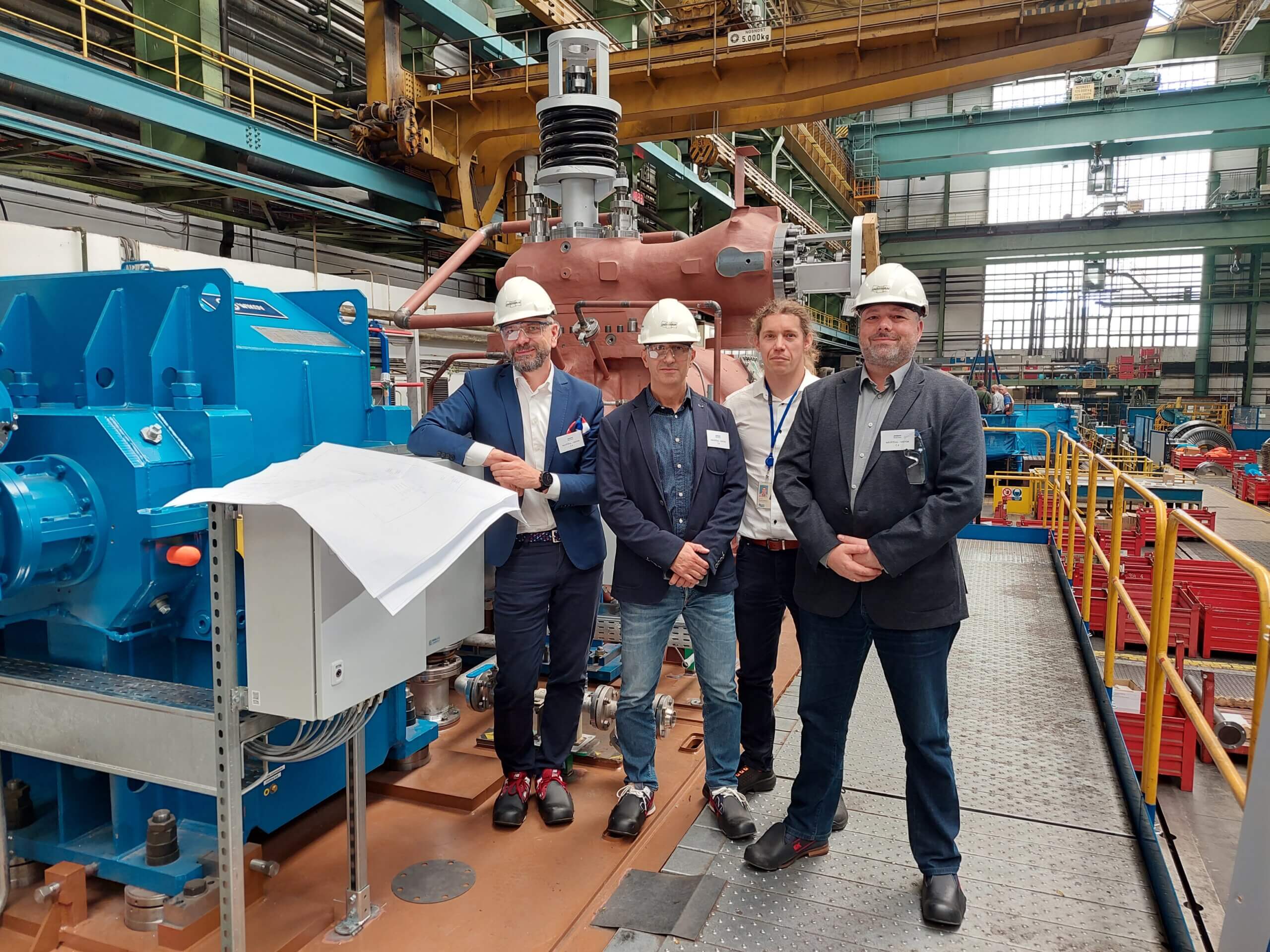 Dostawa i instalacja turbozespołu w budynku maszynowni. Na zdjęciu jest widoczny moment przenoszenia turbozespołu i osadzaniu go w miejscu docelowym.