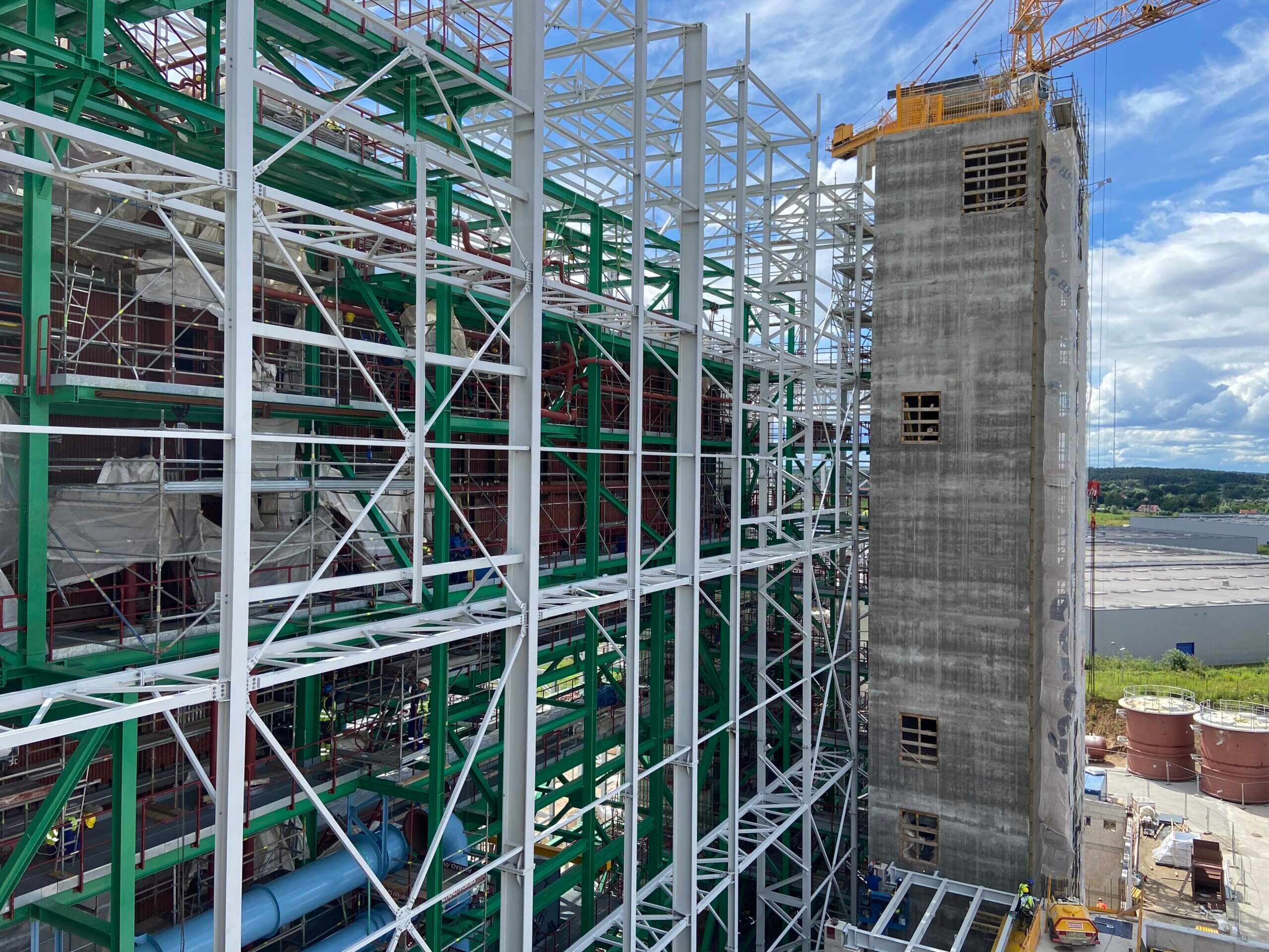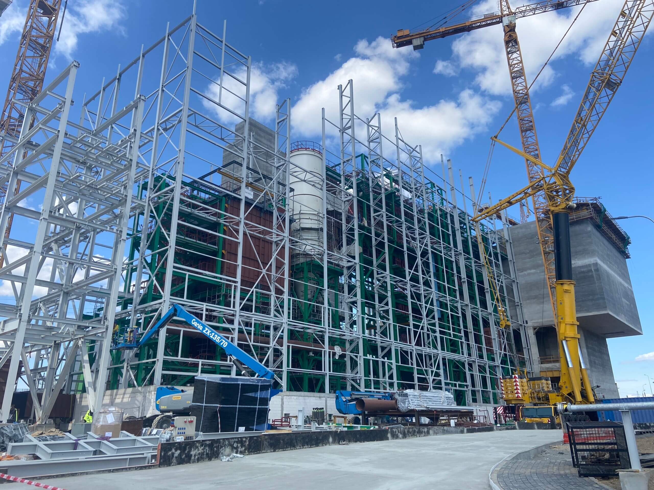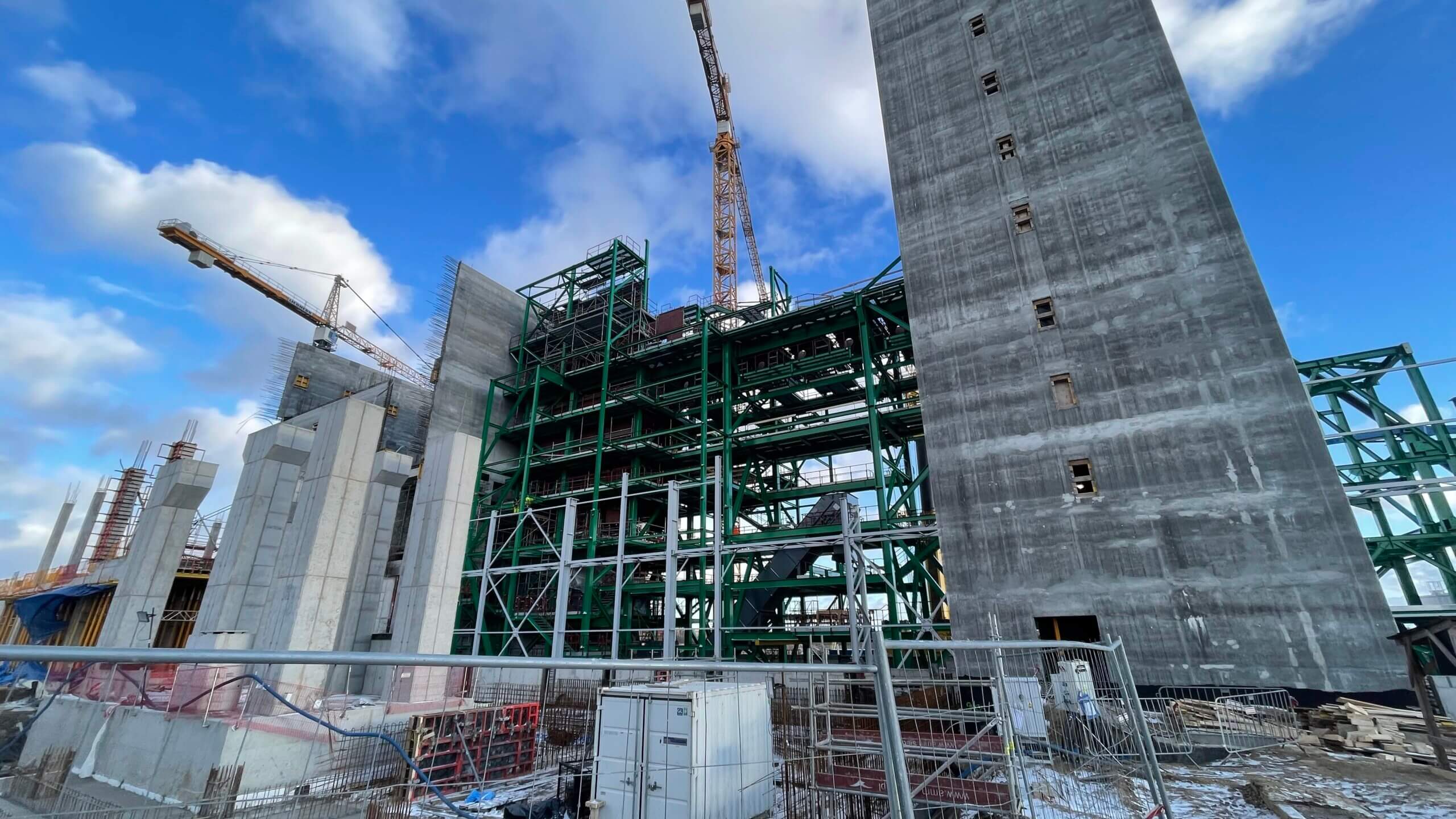 Budowa ITPO – Na zdjęciu widoczna konstrukcja z częścią silosów do przechowywania pyłów z systemu spalania i oczyszczania spalin.