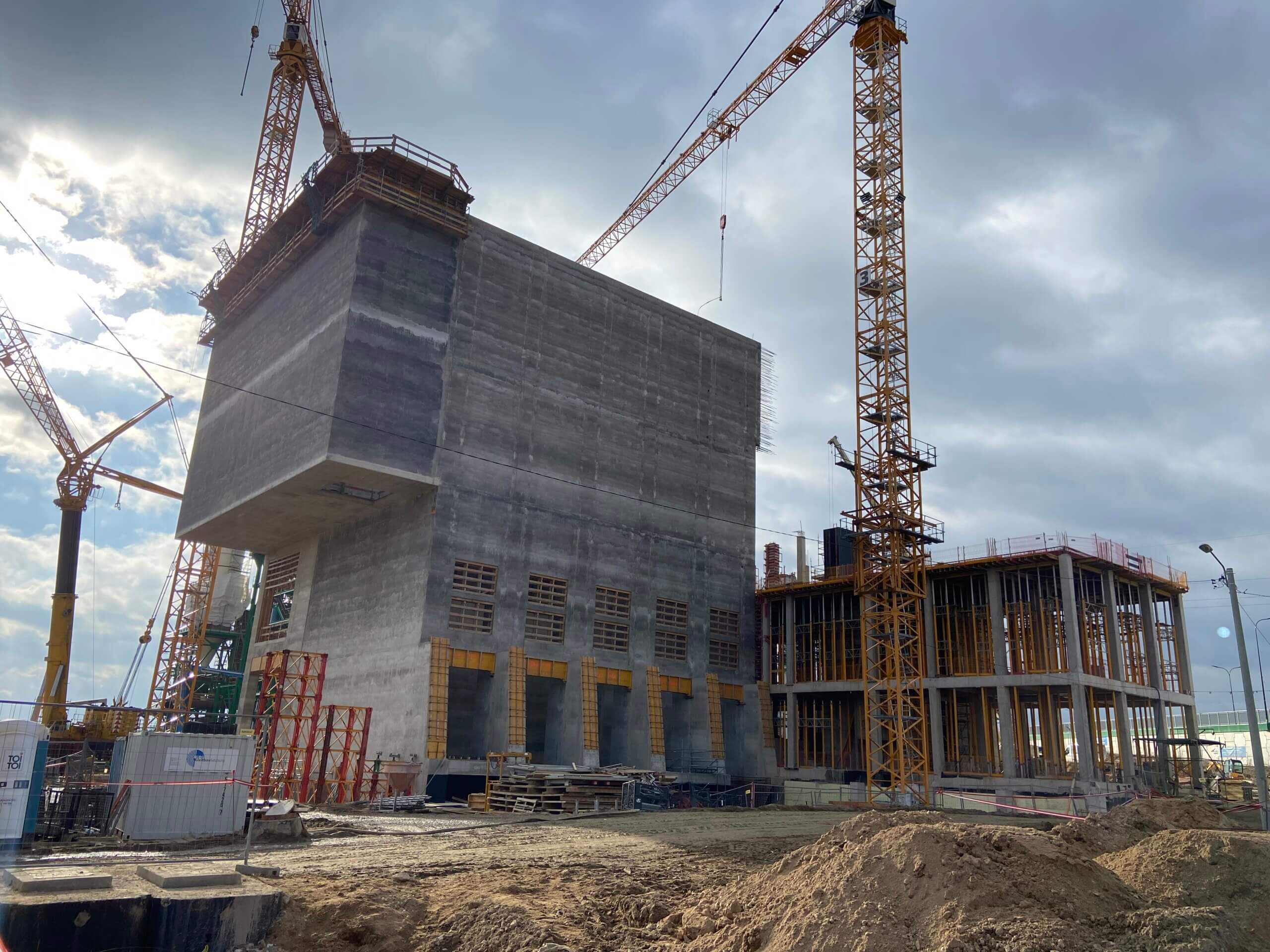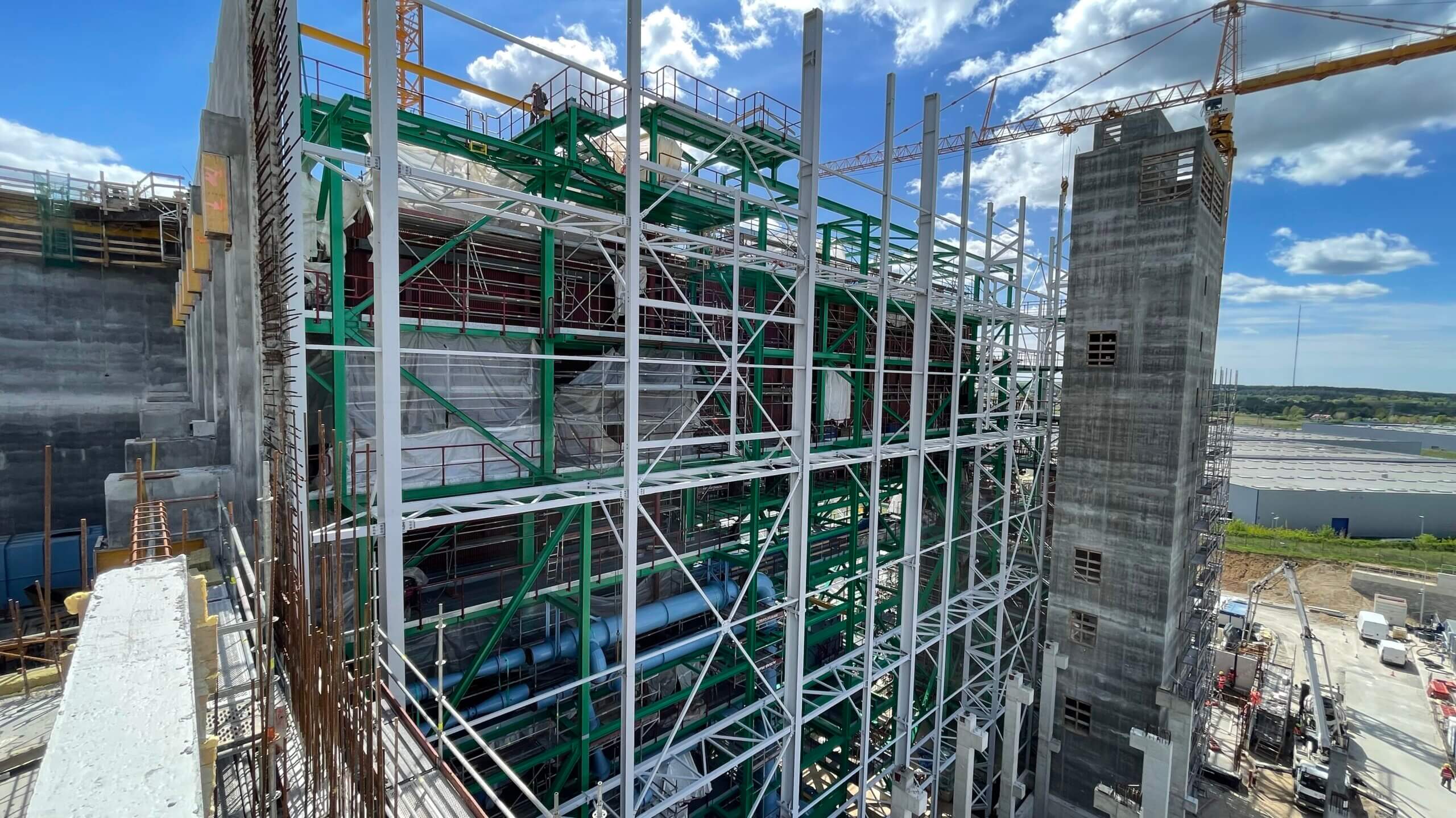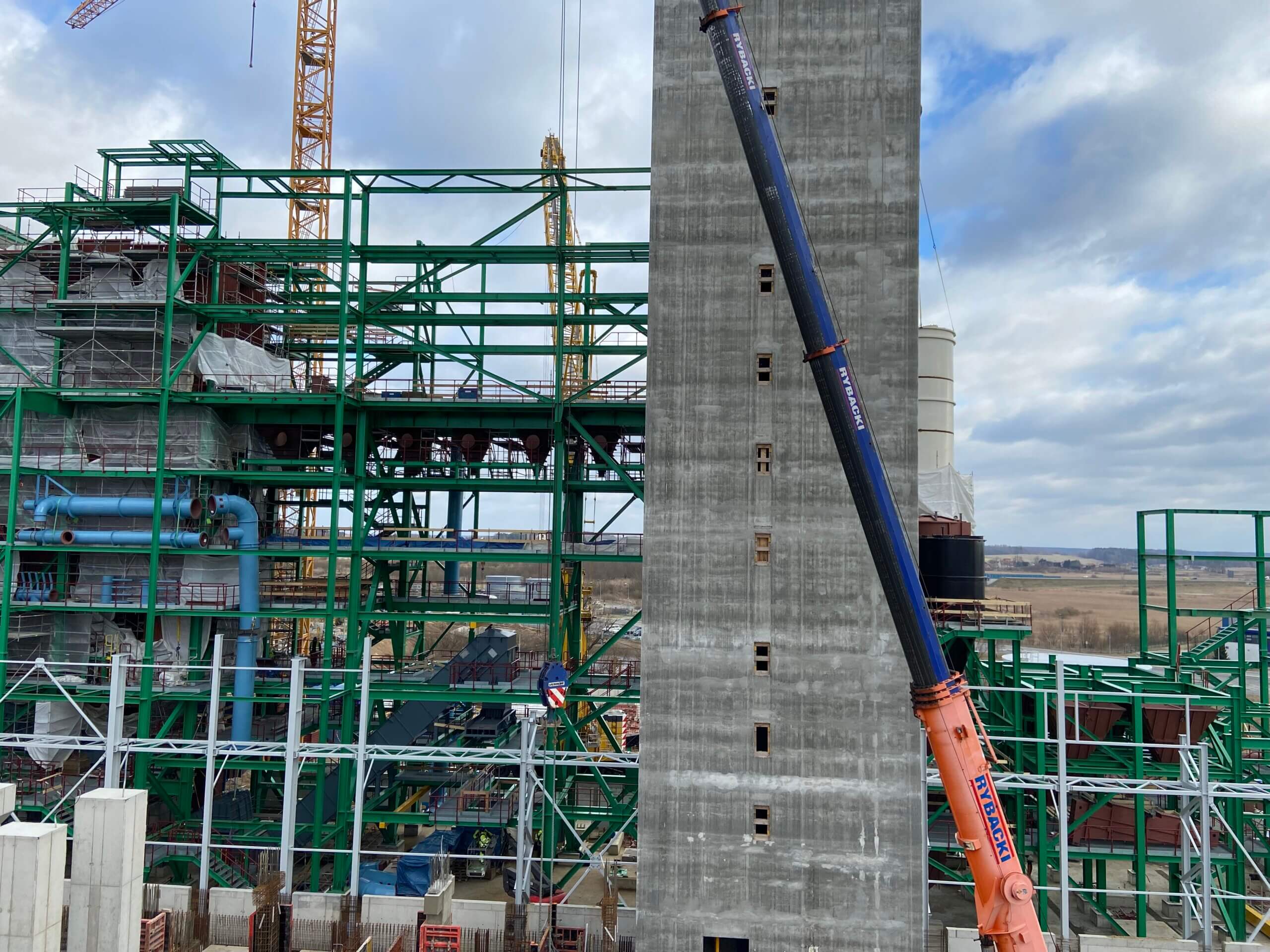 Budowa ITPO – Na zdjęciu widoczna konstrukcja z częścią silosów do przechowywania pyłów z systemu spalania i oczyszczania spalin.