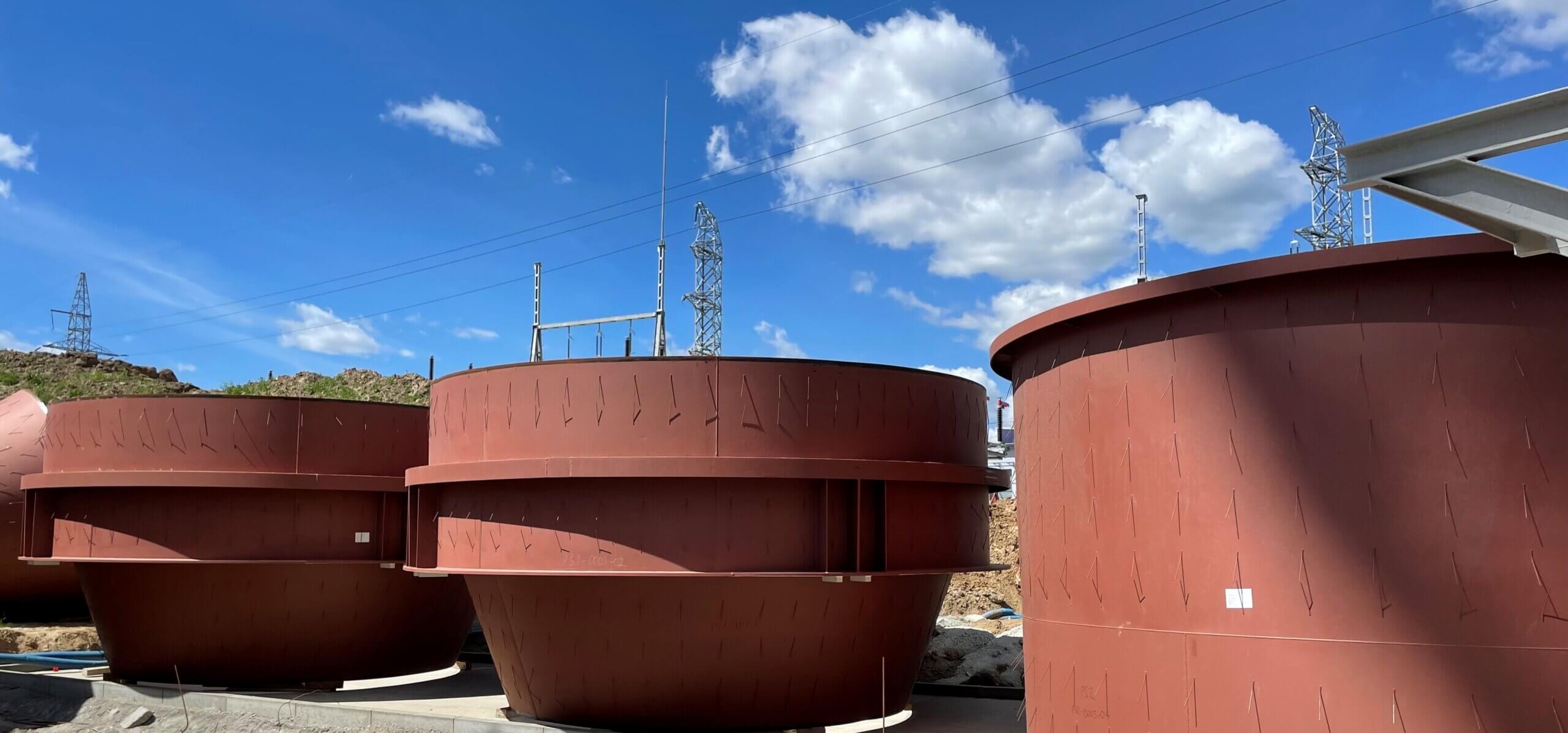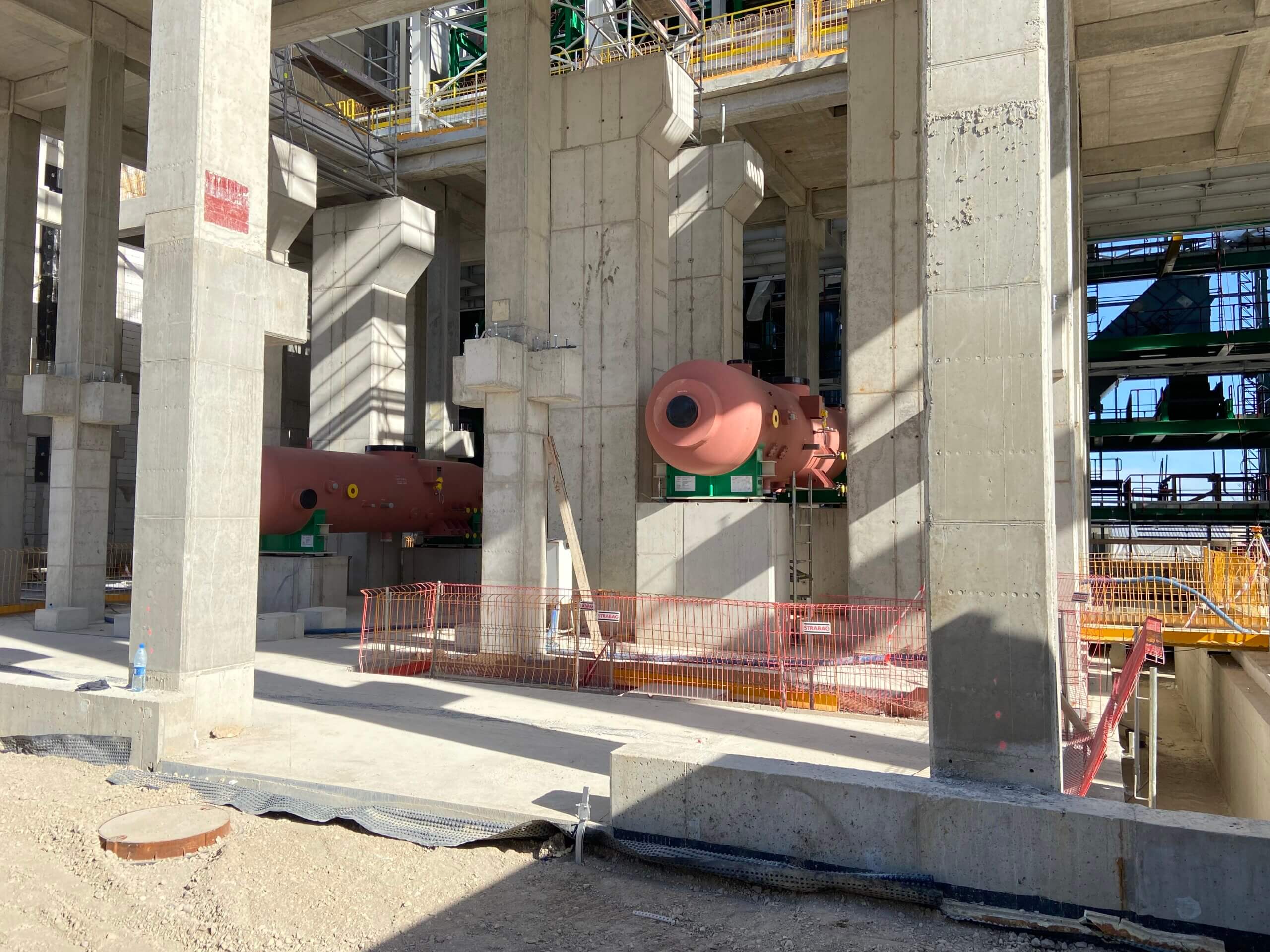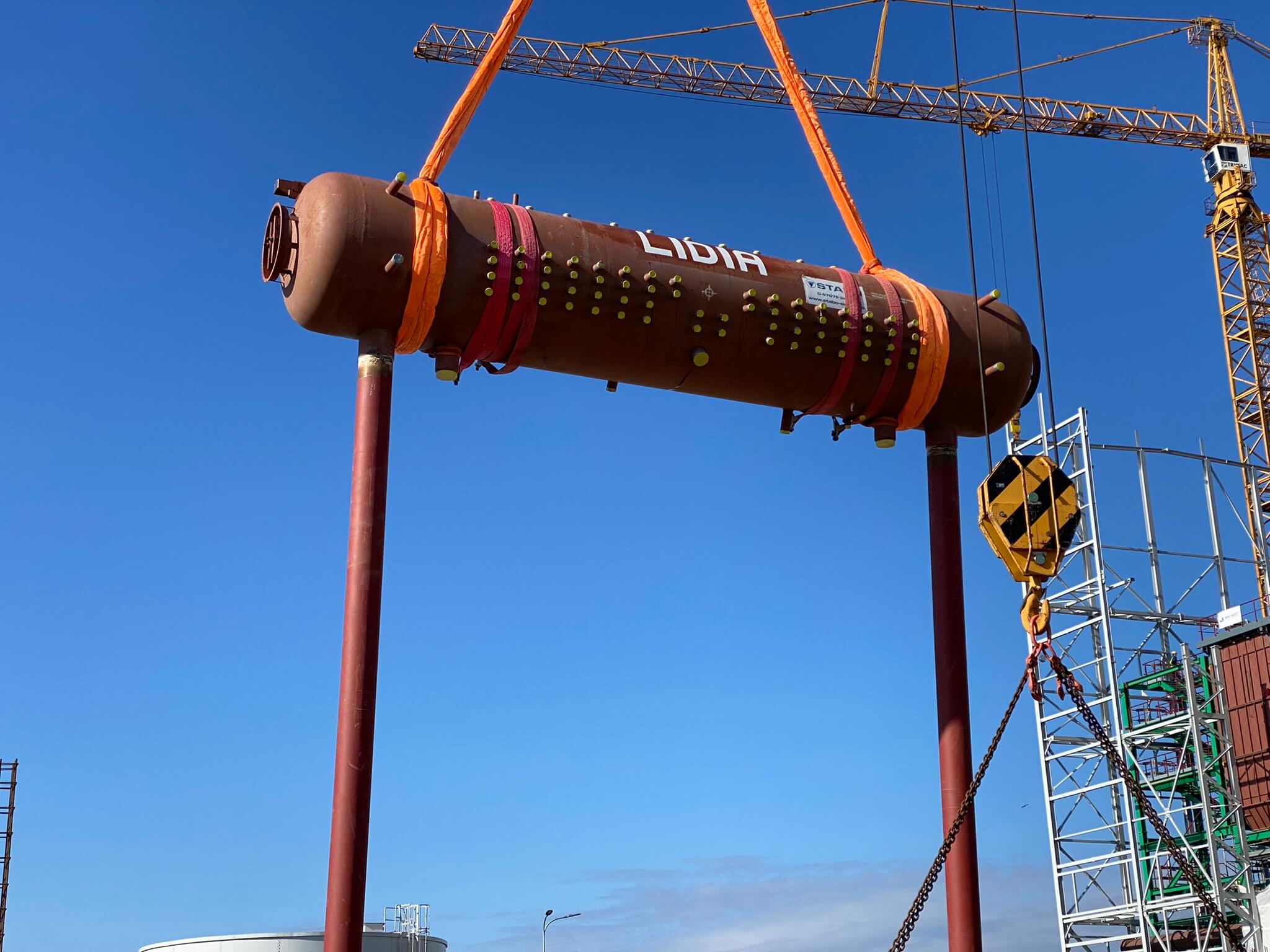Budowa ITPO. Na zdjęciu widoczne są dwa zbiorniki ciśnieniowe układu parowo-wodnego Instalacji tzw. odgazowywacze termiczne. Ich zadaniem jest usunięcie gazów zawartych z cieczy.