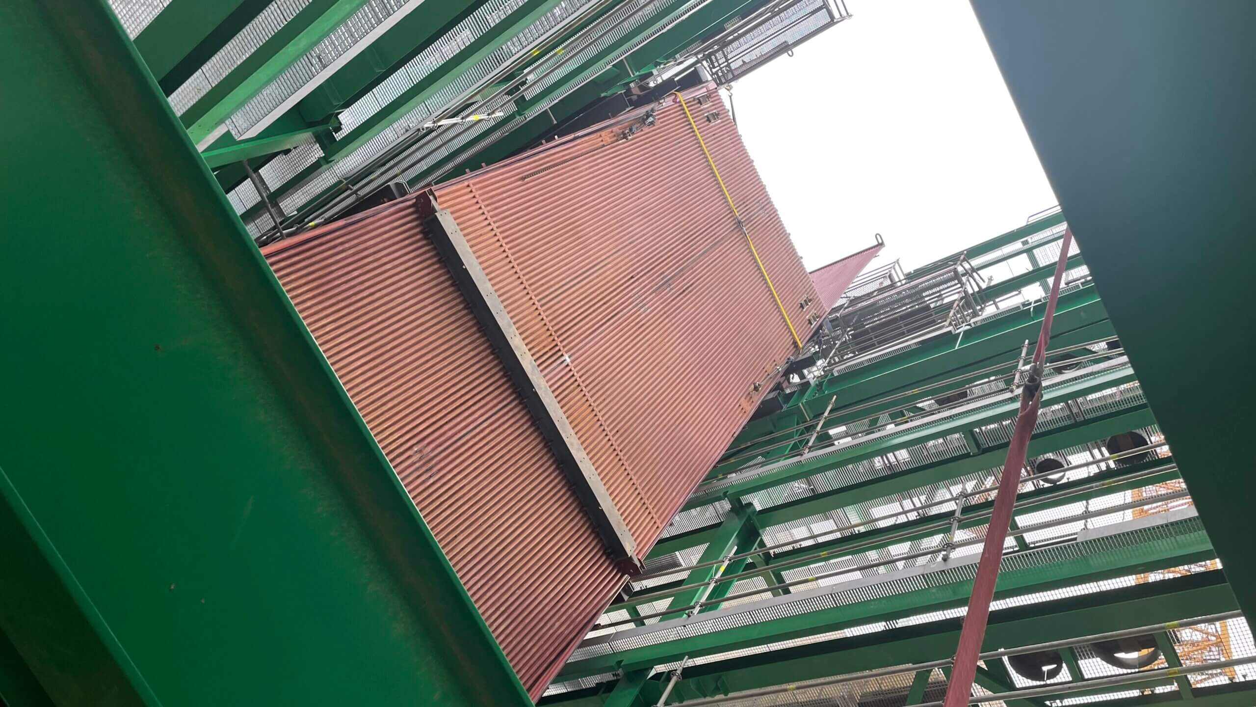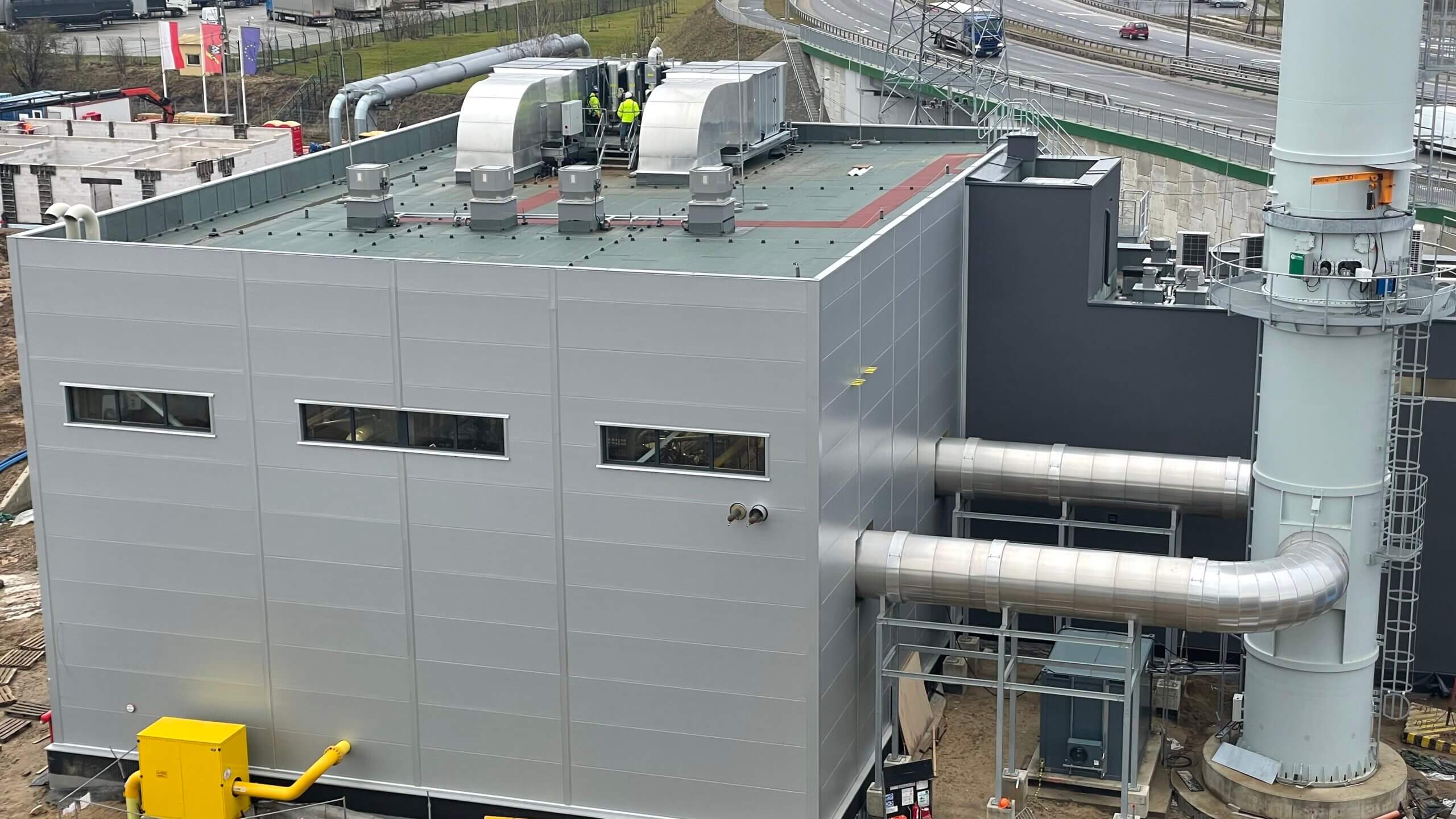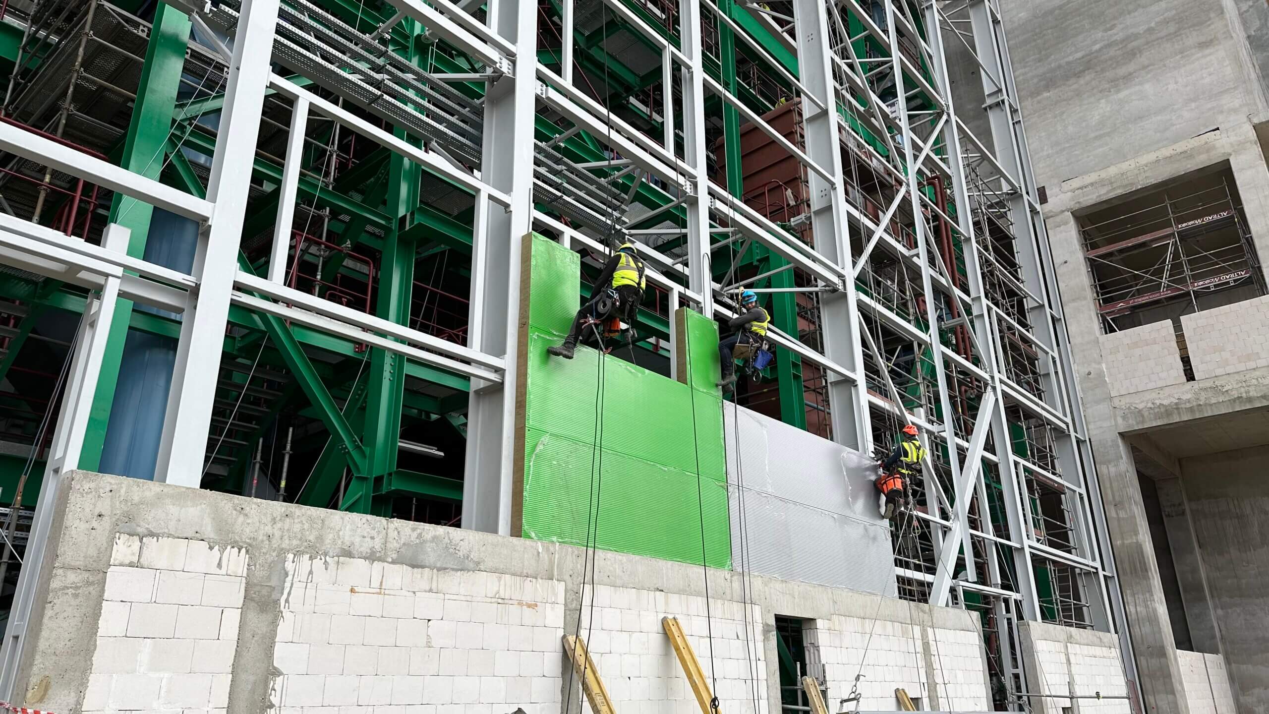 Instalacja ścian na budynku kotłowni ITPO. Ściany kotłowni są wykonywane z tak zwanych paneli wielowarstwowych i są montowane jako panele przez alpinistów.