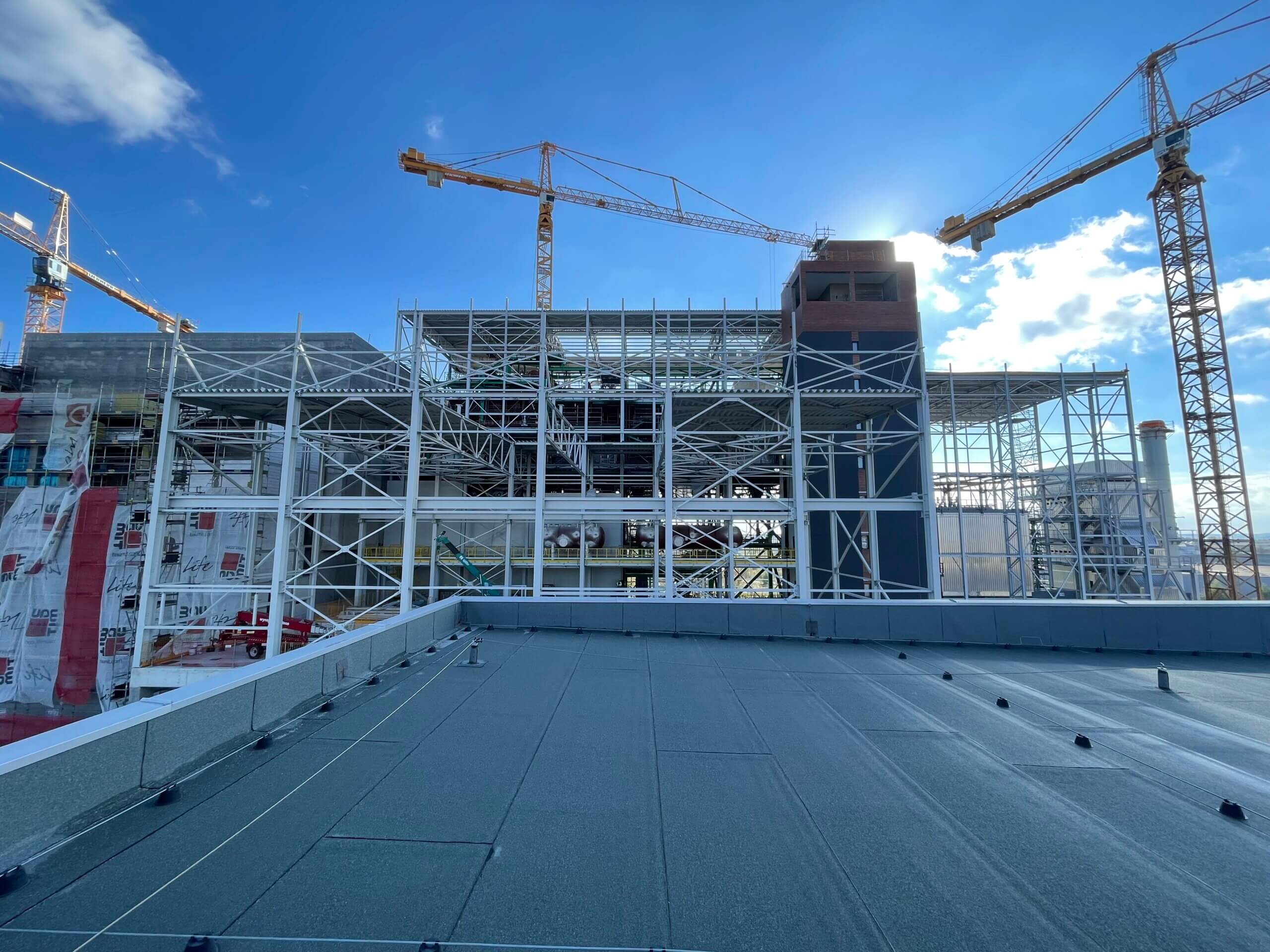 Budowa ITPO. Widok na konstrukcję dachu maszynowni w którym będzie zainstalowany turbozespół. Po lewej stronie zdjęcia za konstrukcją stalową budynku zainstalowany jest kocioł.