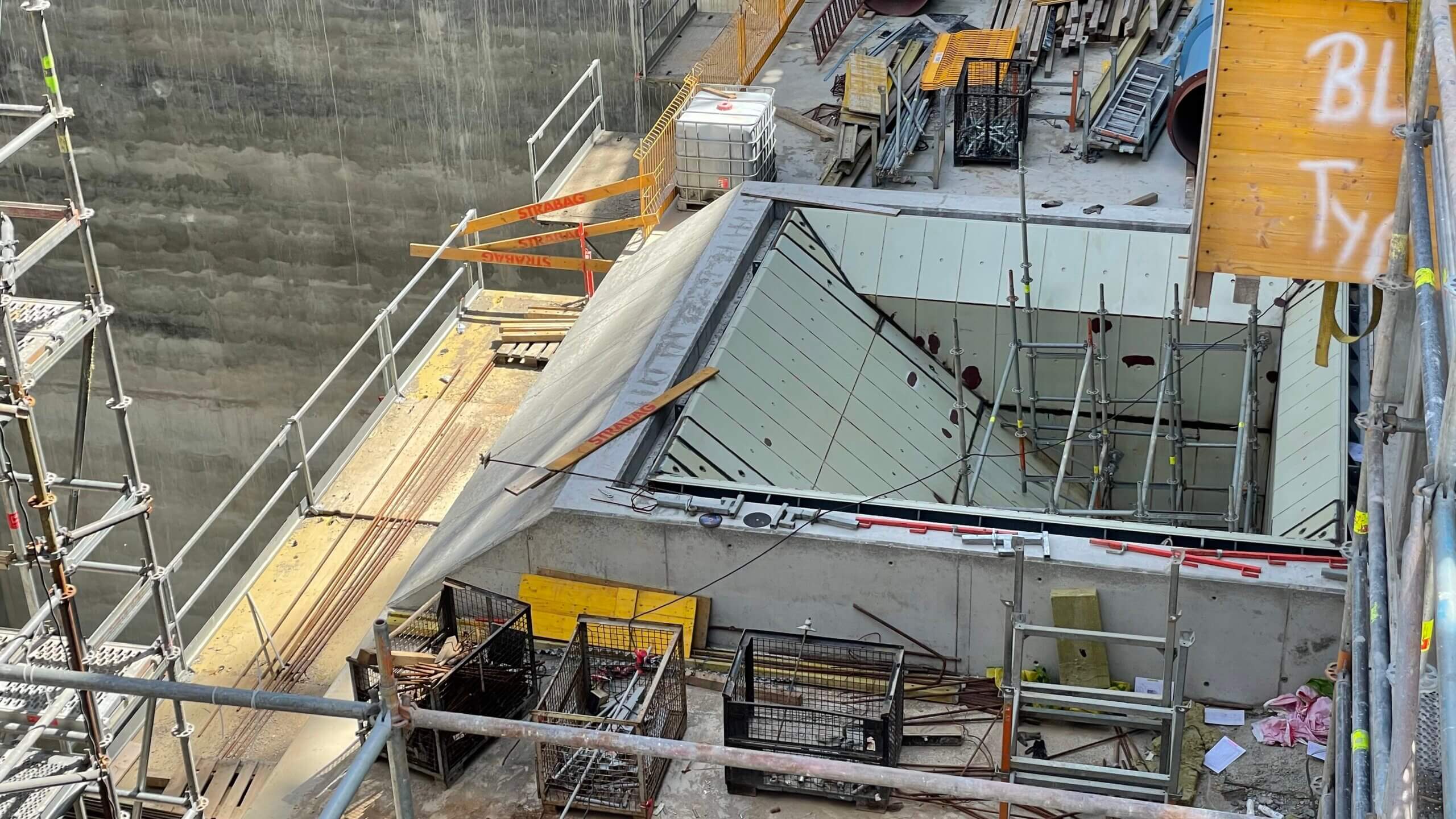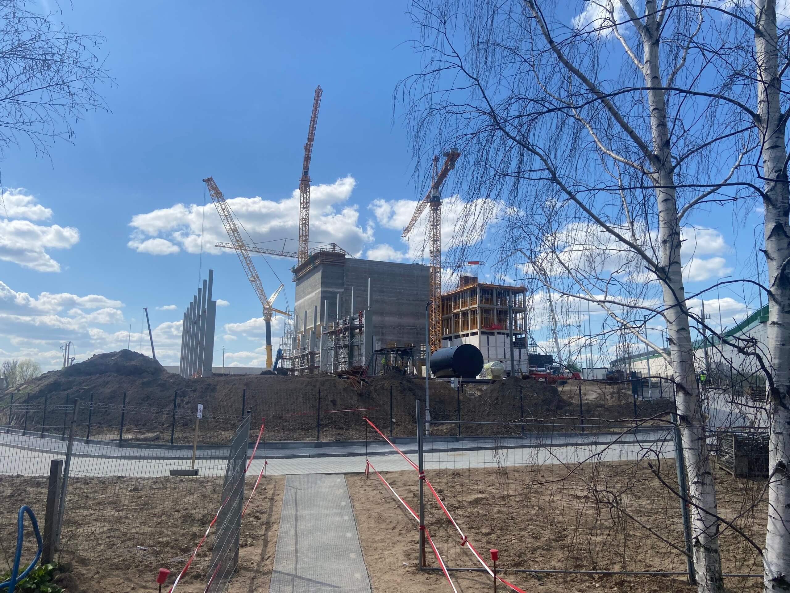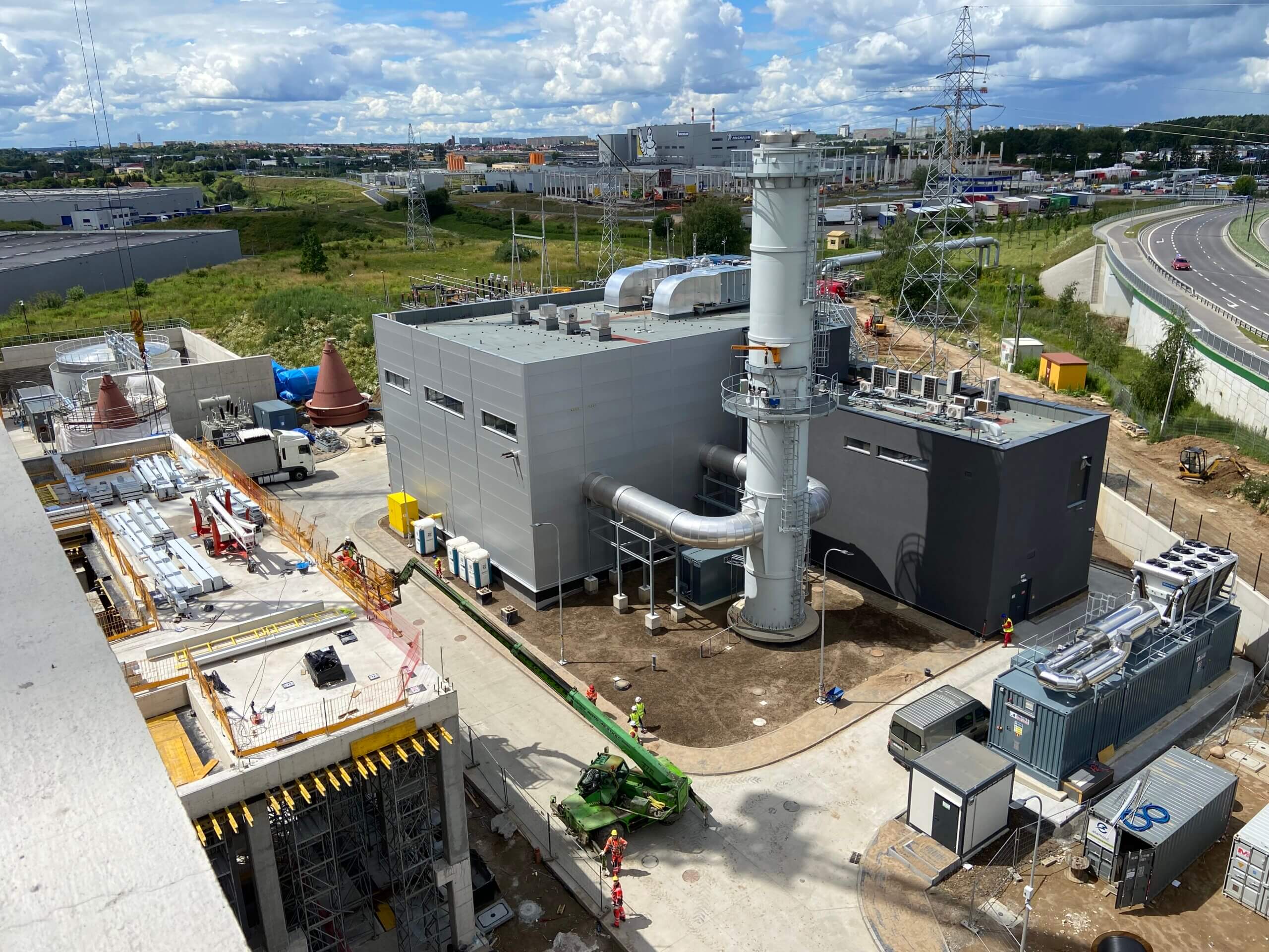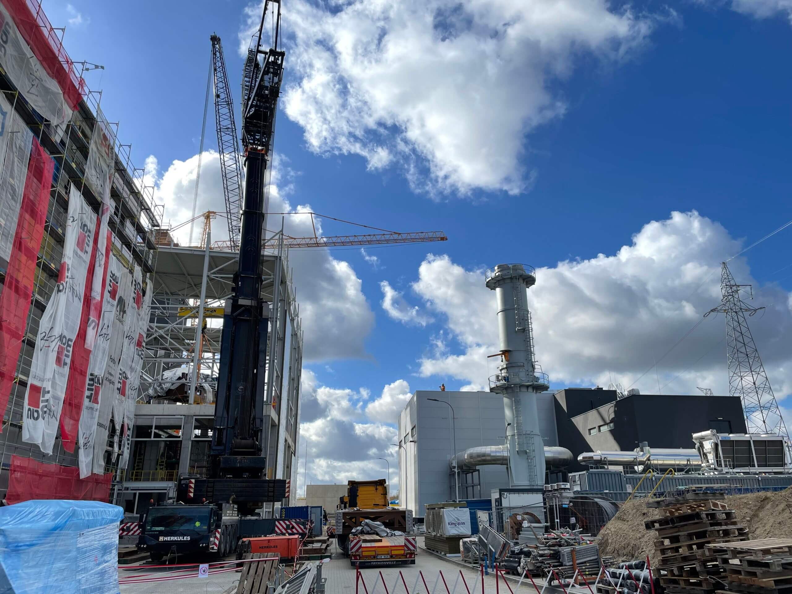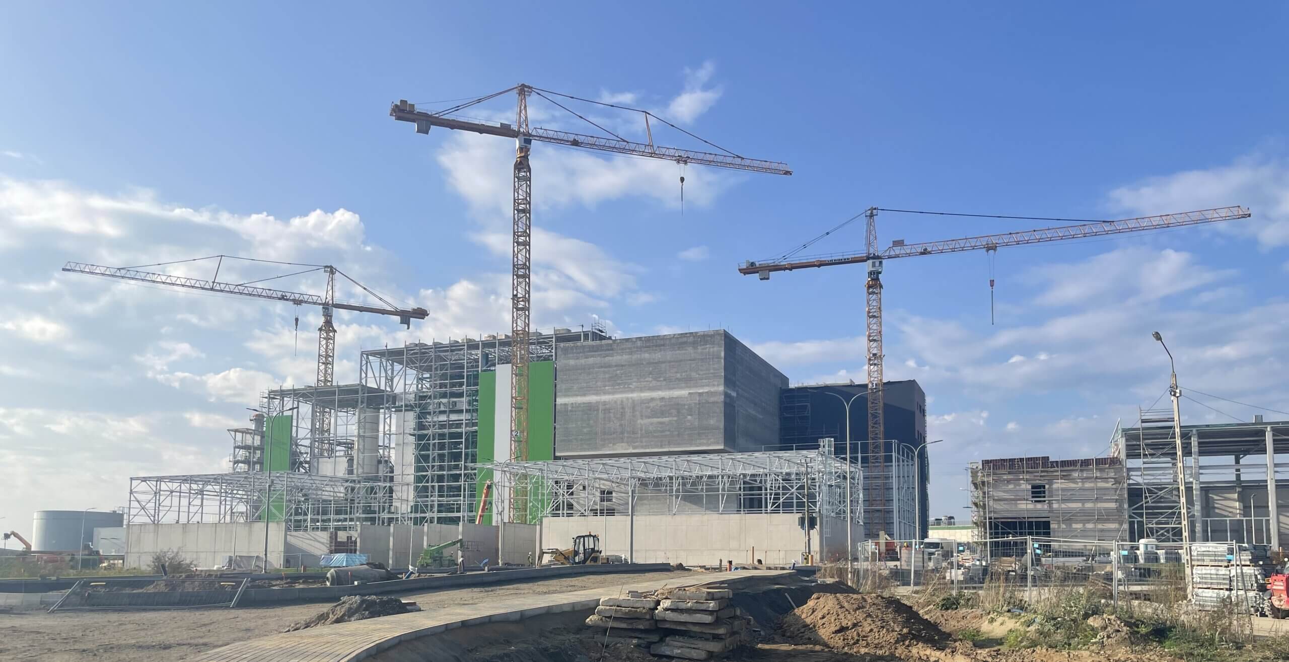 Budowa ITPO – Na zdjęciu widoczna konstrukcja z częścią silosów do przechowywania pyłów z systemu spalania i oczyszczania spalin. Na prawo od konstrukcji silosów widoczne są zbiorniki środka redukcji NOx.