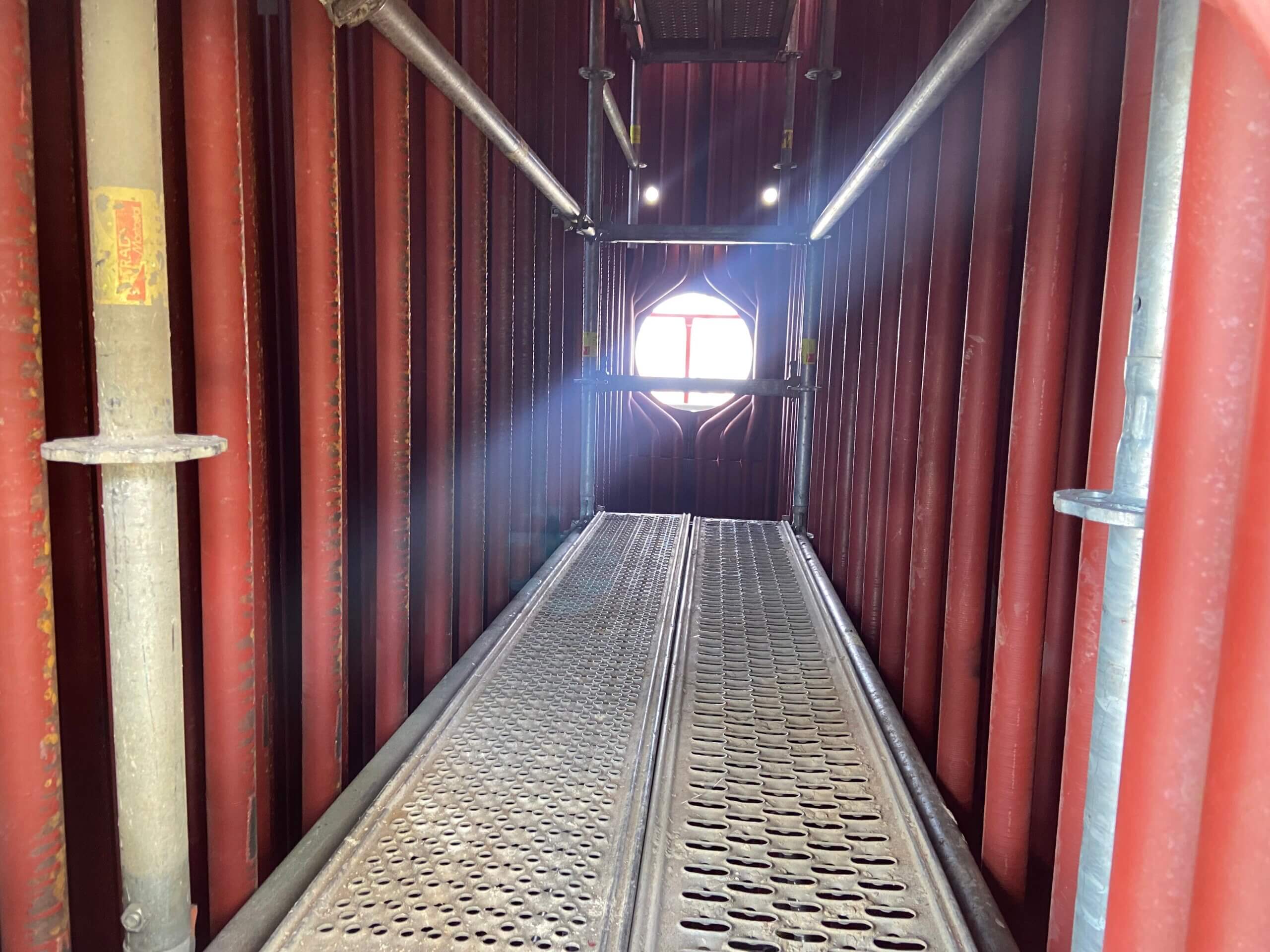 Budowa ITPO – Wnętrze komory spalania, czyli pierwszego ciągu kotła z zainstalowanym systemem ochrony ścian membranowych kotła.