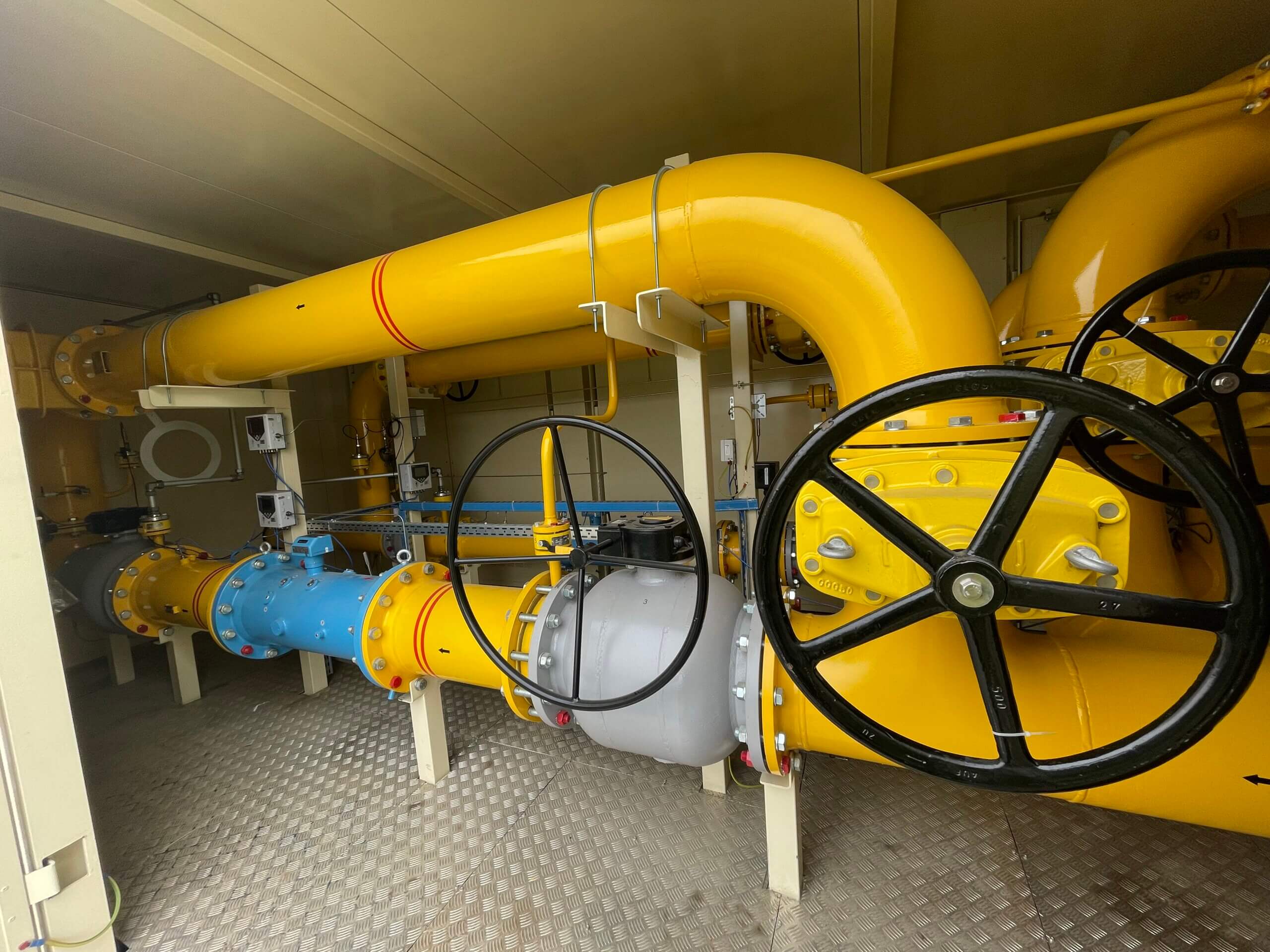 Na zdjęciu widoczna jest część systemu zabezpieczenia przed pożarem, a raczej walki z nim, czyli zbiornik z zapasem wody do gaszenia ewentualnego pożaru, a za nim pompowania ppoż., w której są zainstalowane dwie pompy tłoczące wodę do systemu hydrantów i innych urządzeń przeciwpożarowych korzystających z wody. Zapas wody w zbiorniku jest automatycznie uzupełniany z sieci miejskich wodociągów.