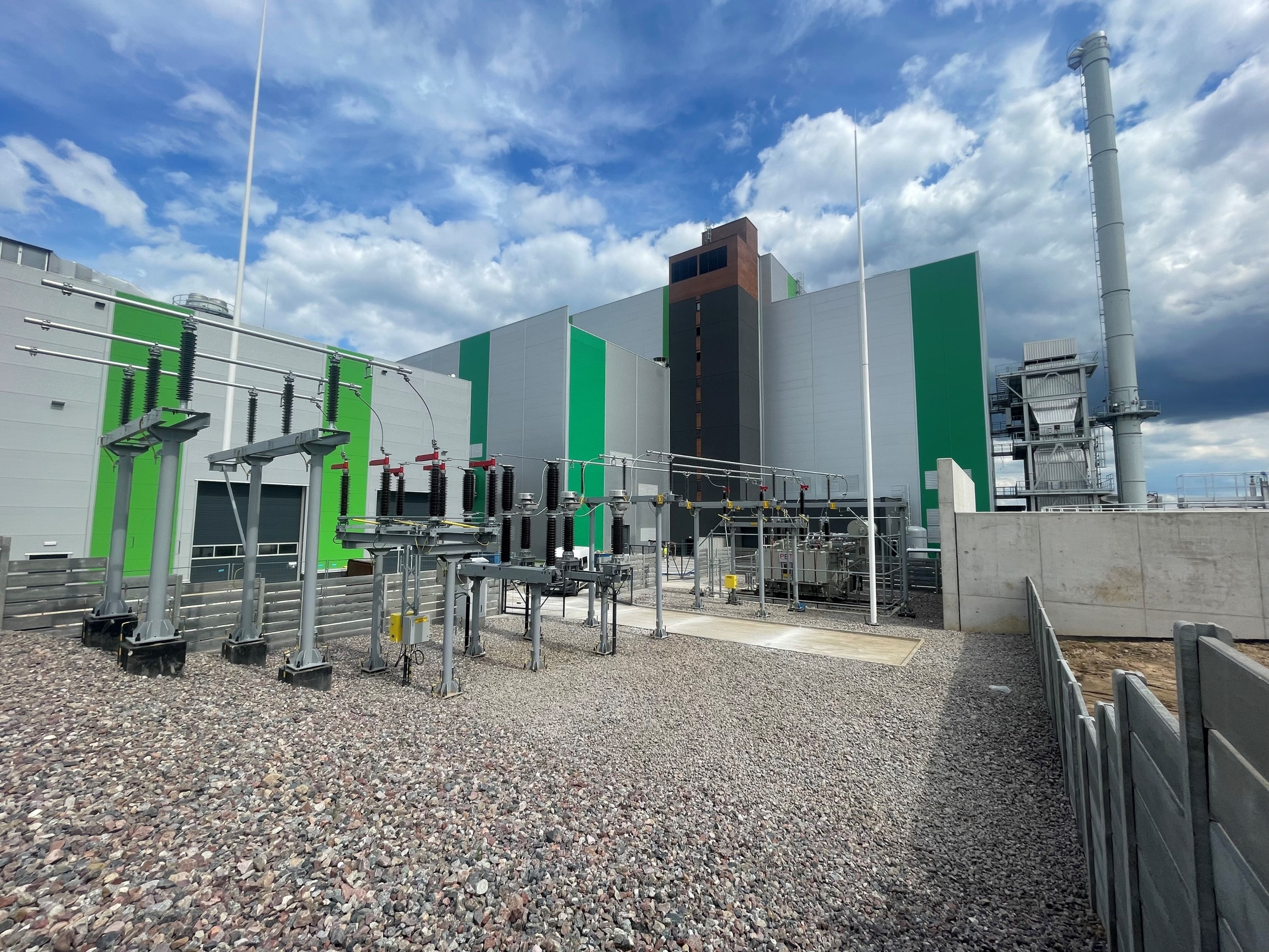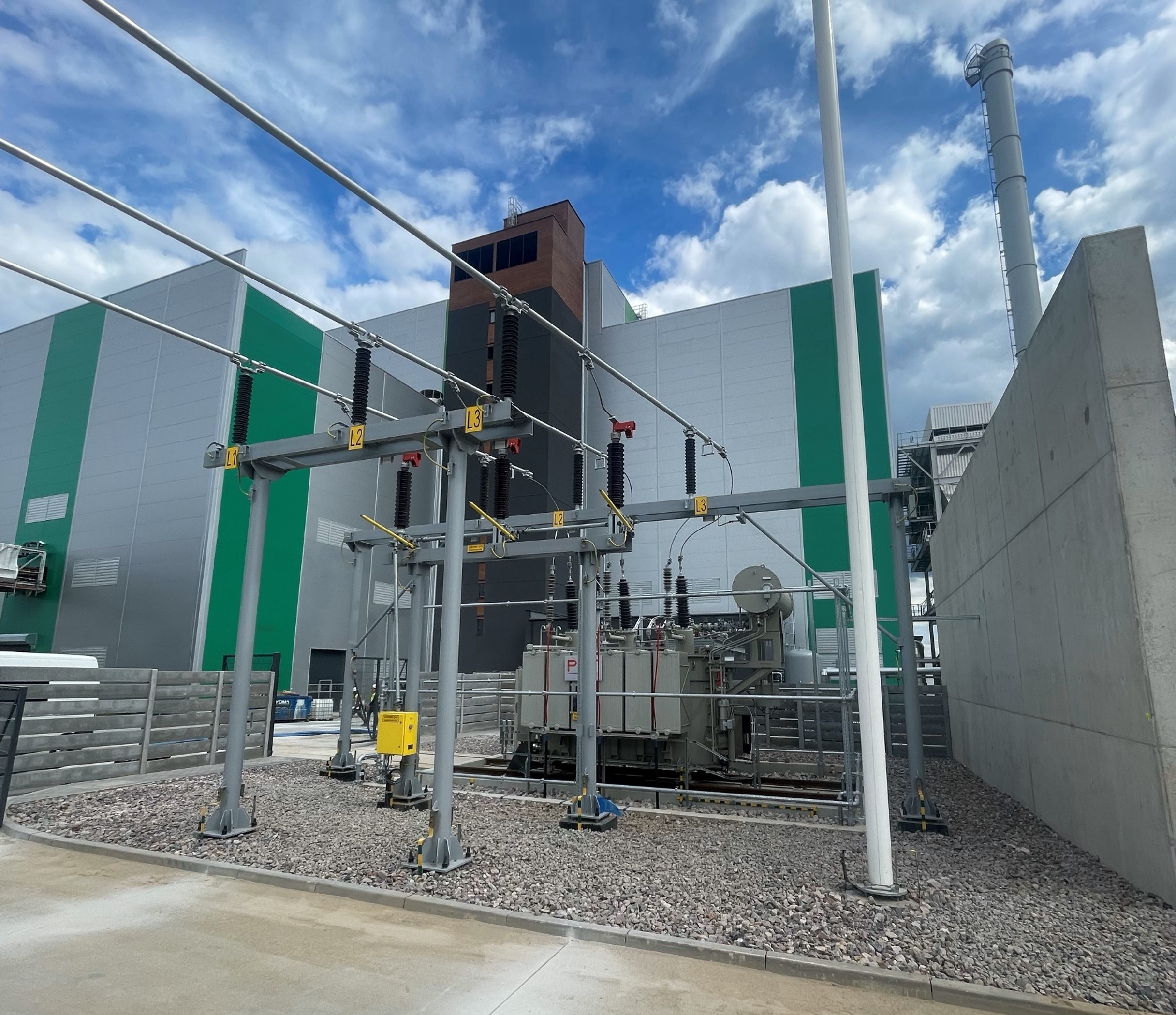 Układ wyprowadzenia energii elektrycznej wyprodukowanej w instalacji oraz zasilania w przypadku turbozespołu do sieci 110kV. W tle widoczna kotłownia szczytowa (po lewej) oraz budynki maszynowni i kotłowni wraz z systemem oczyszczania spalin