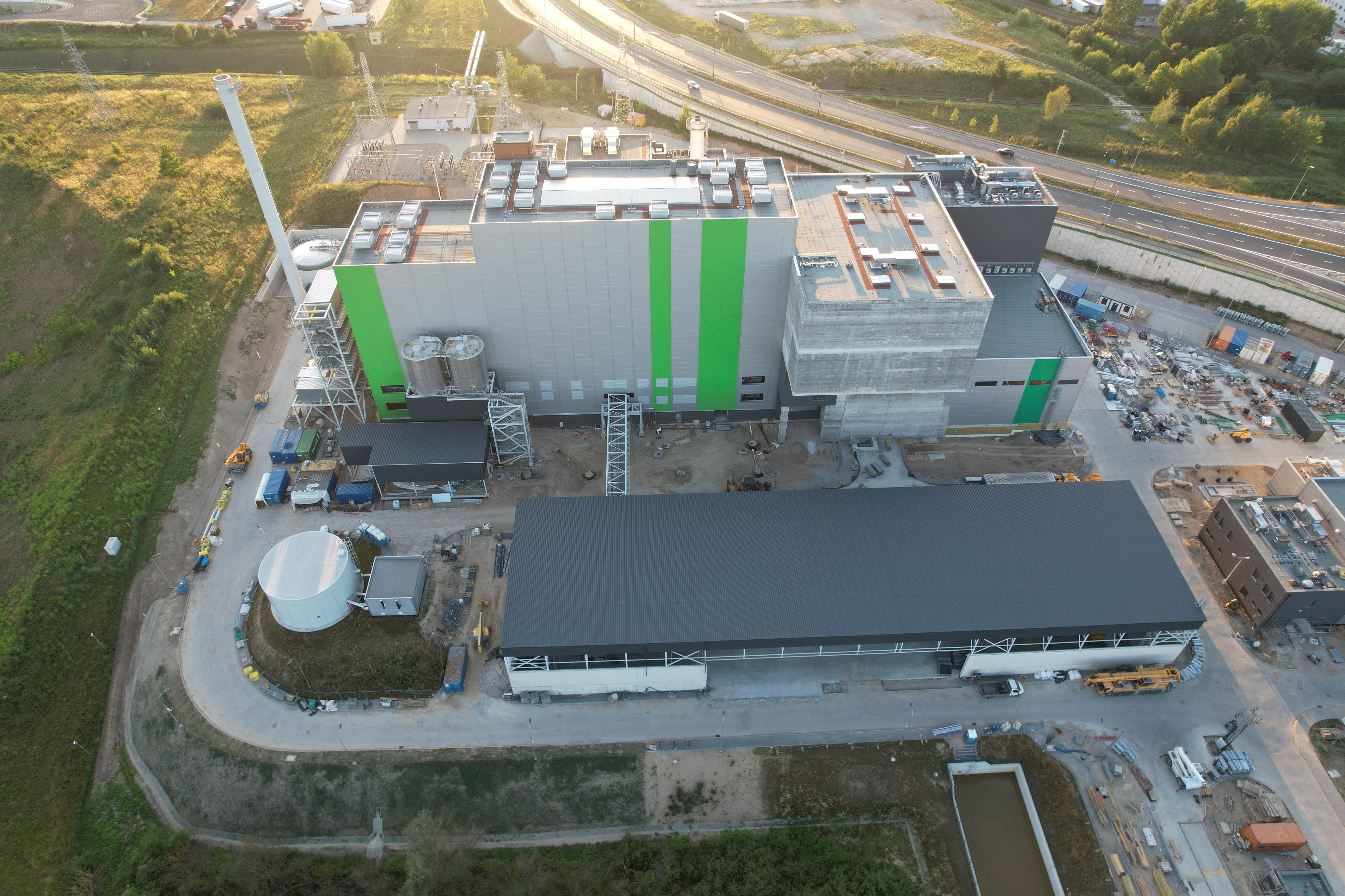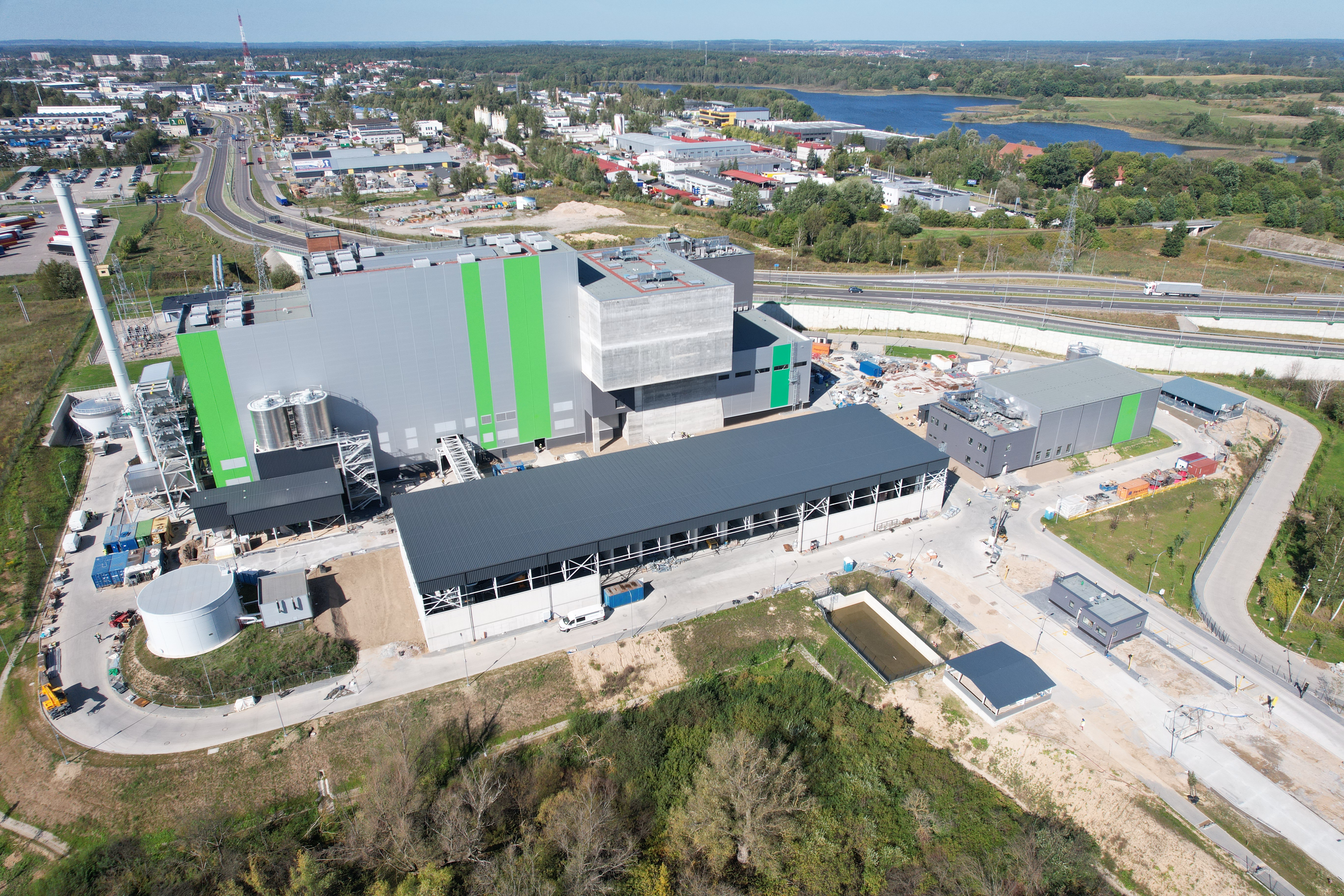 Budowa ITPO, widok instalacji z brzegu zbiornika ekologicznego zlokalizowanego na terenie Instalacji. W tle widoczny budynek waloryzacji żużla, hala kotła z oczyszczaniem spalin i bunkra na paliwo