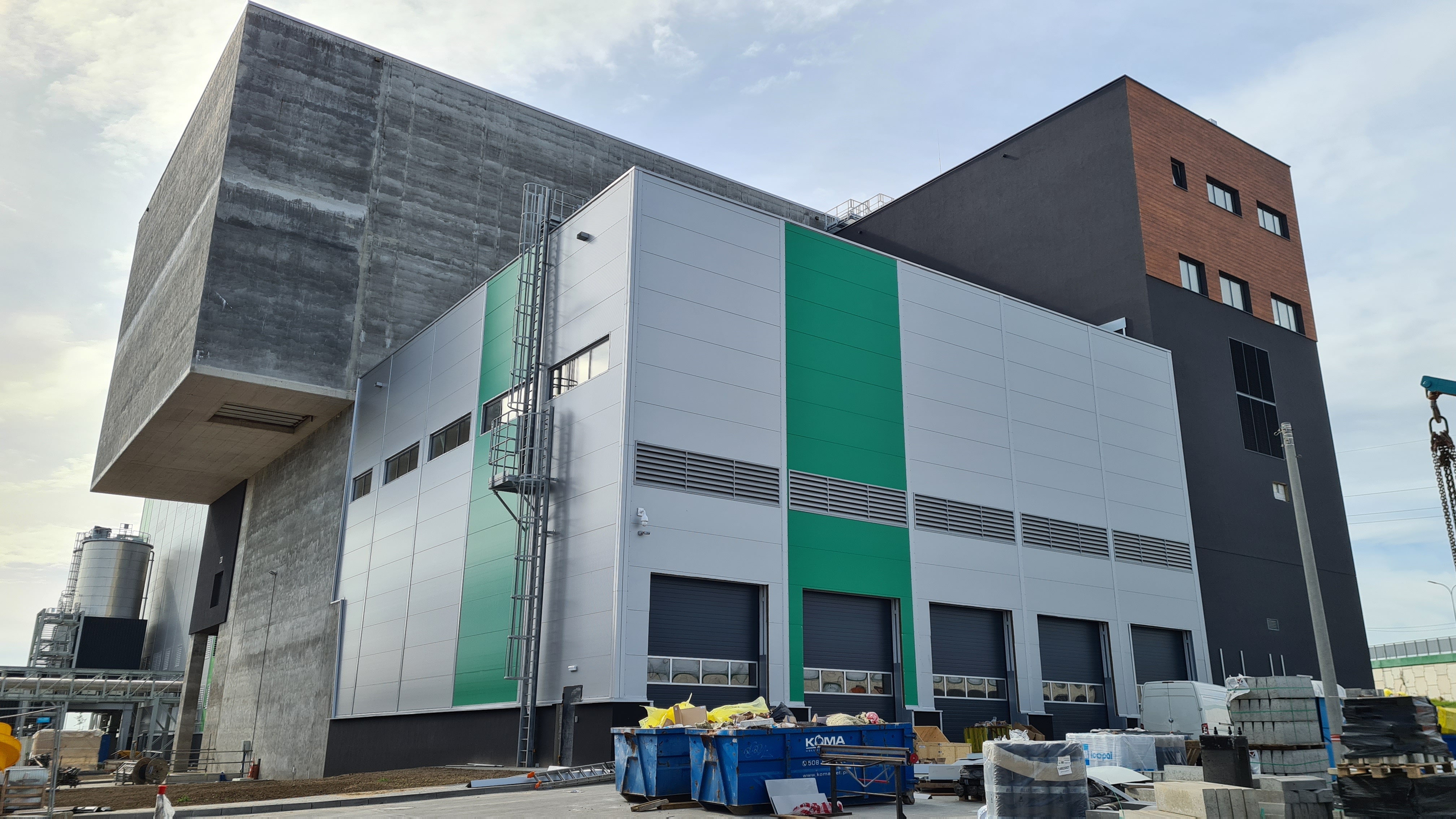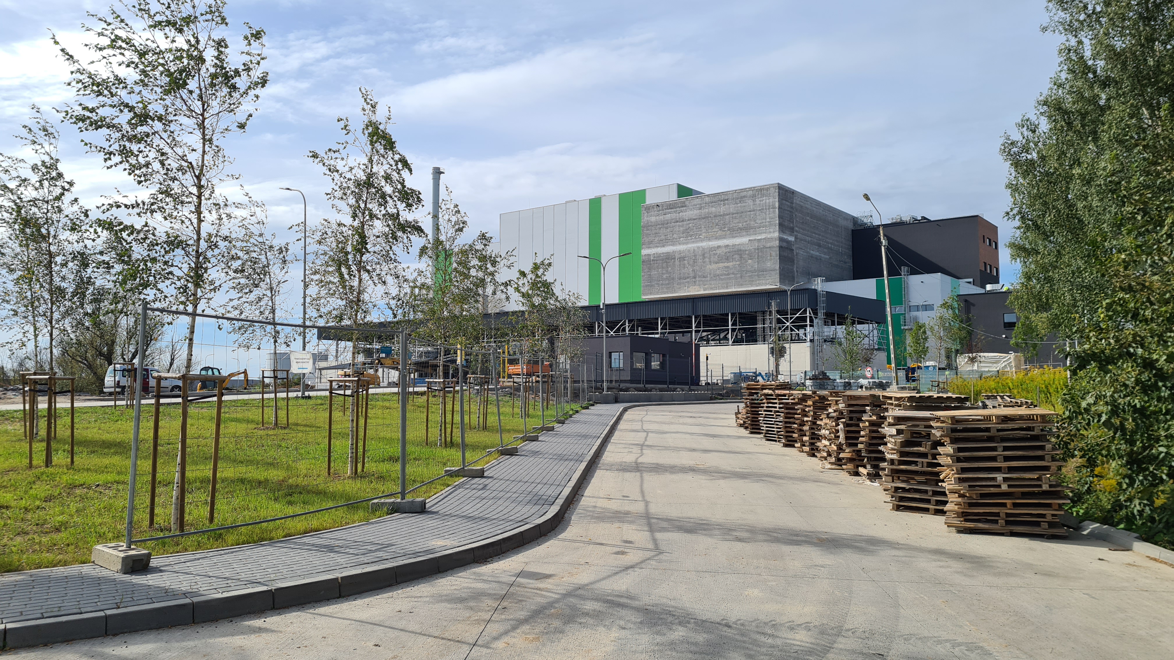 Widok na Instalację, nasadzenia na terenach. Widok na halę waloryzacji żużla, bunkier oraz kotłownię.