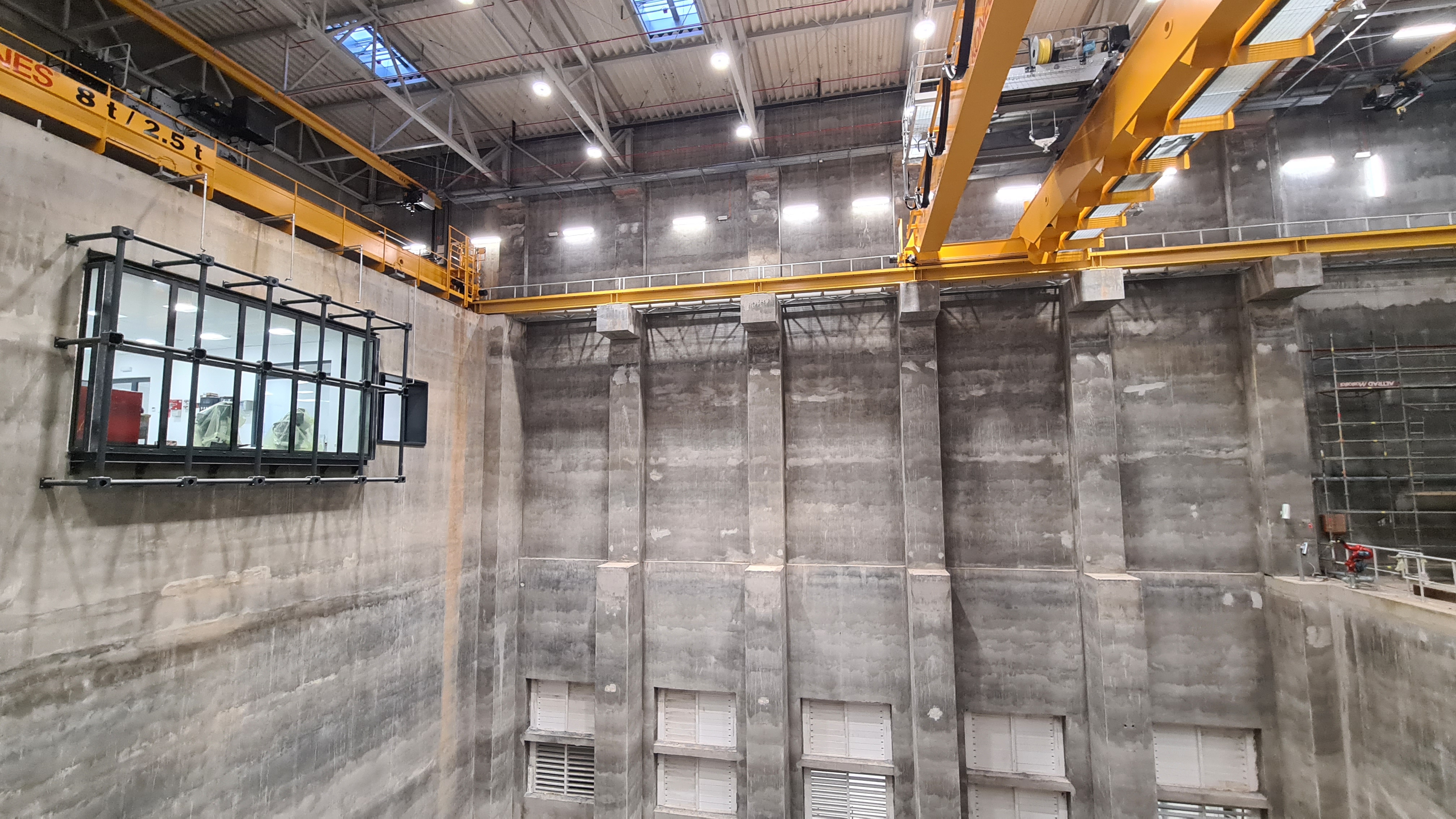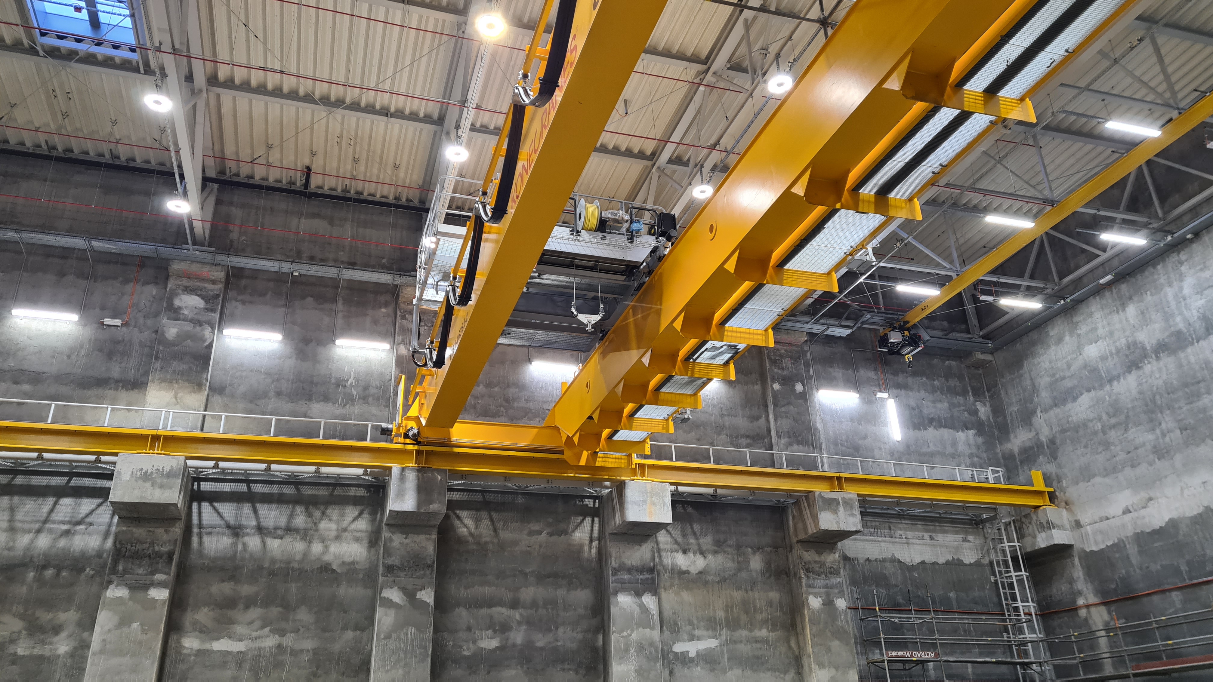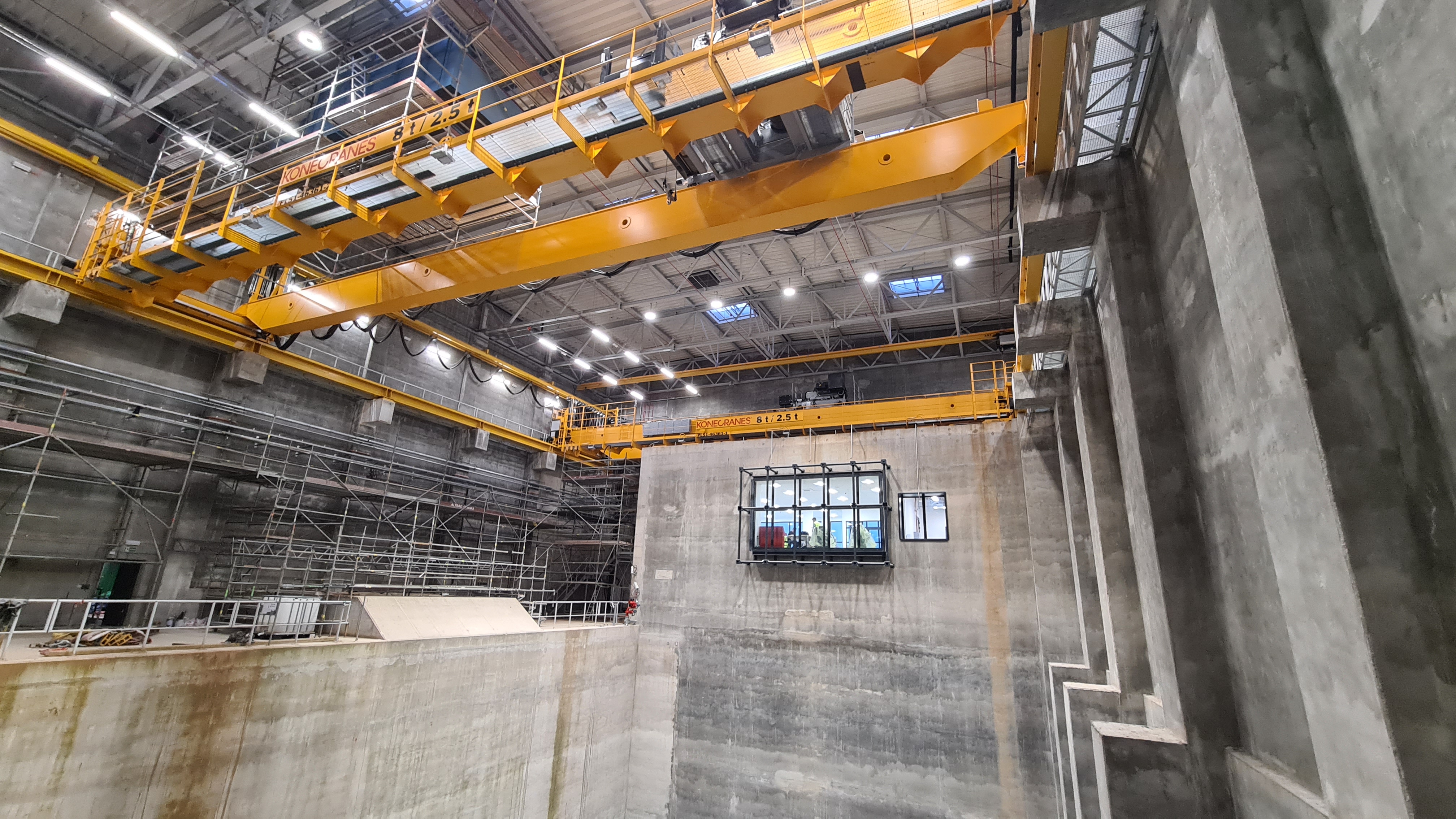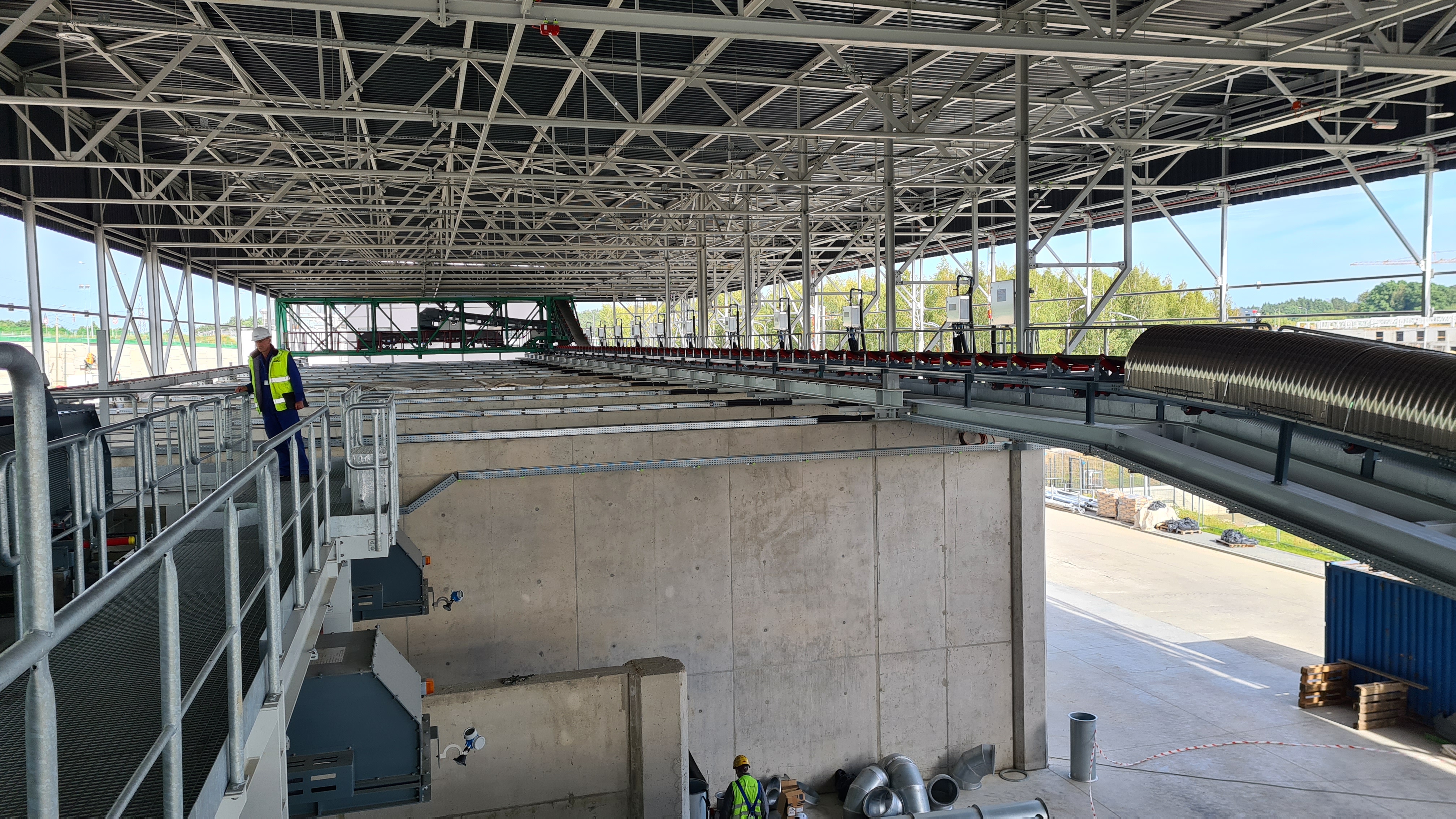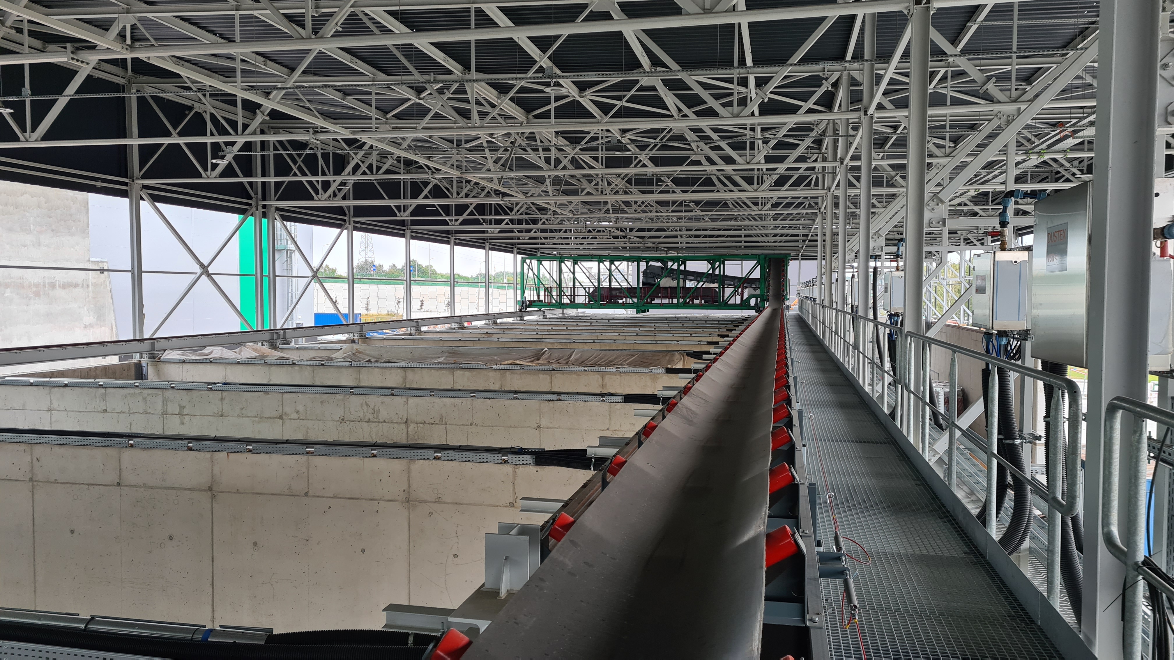 Budynek bunkra na paliwo dla kotła, na zdjęciu widoczne jest okno operatora suwnicy, jedną z dwóch suwnic i konstrukcję dachu.