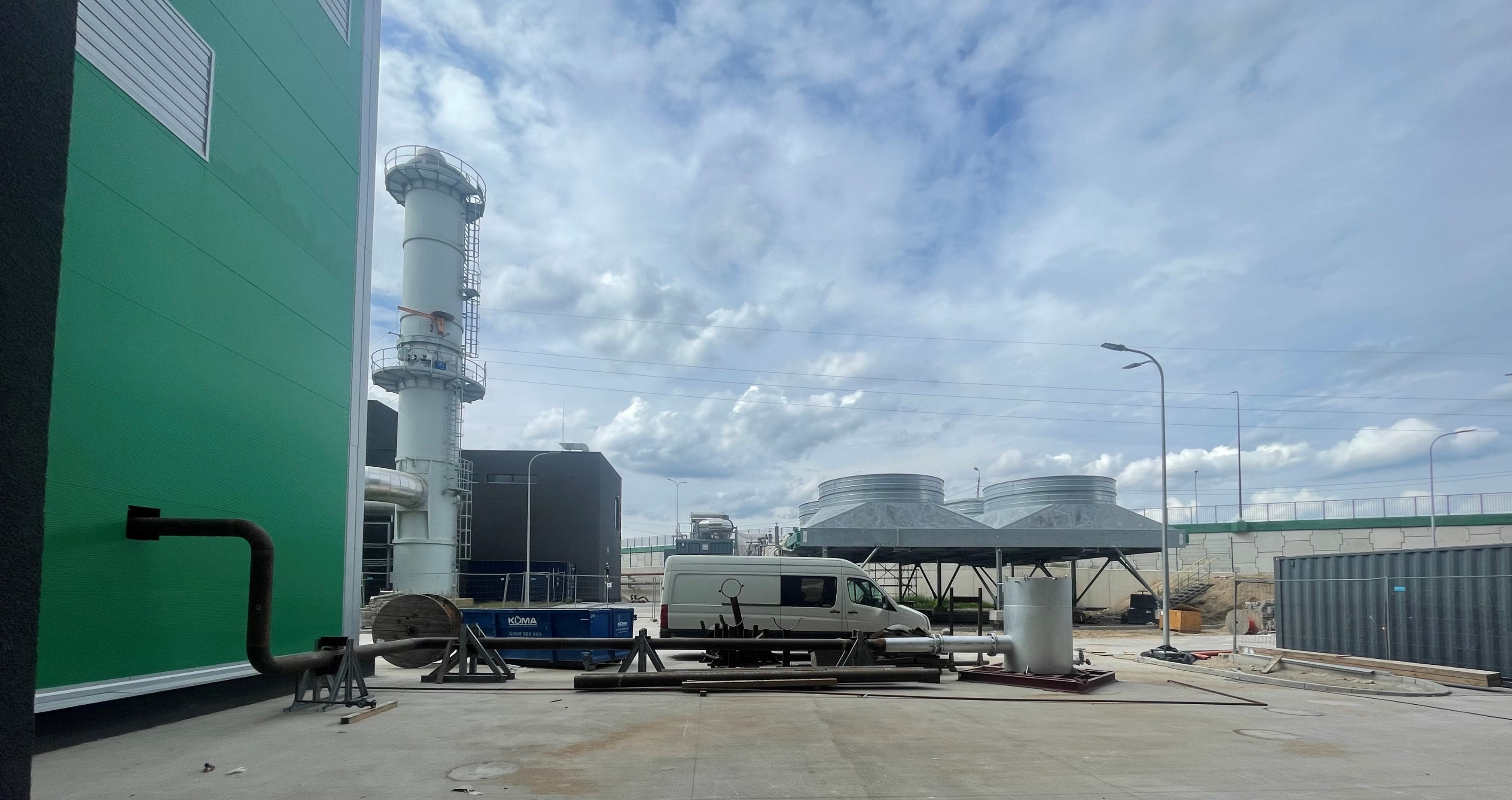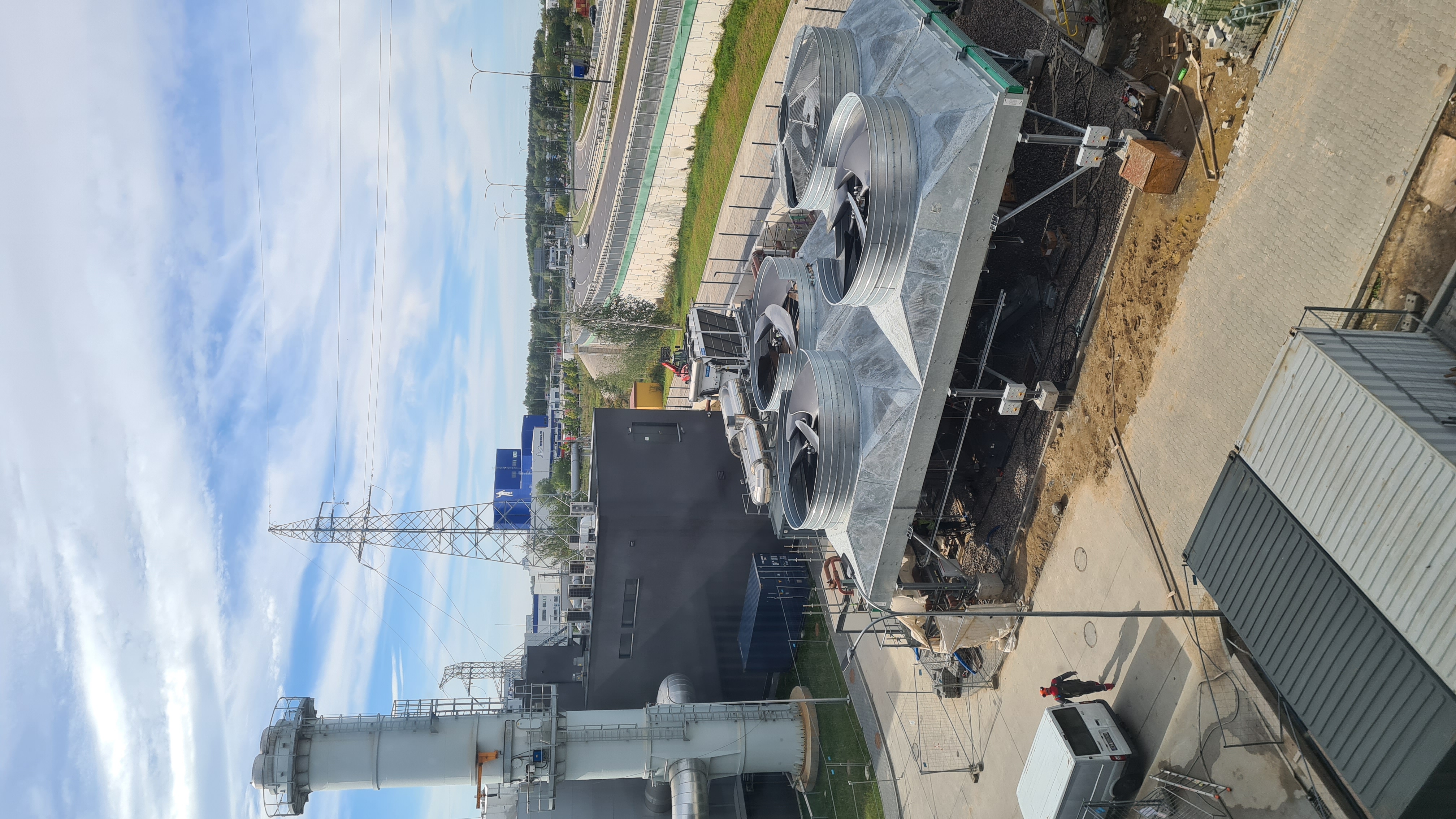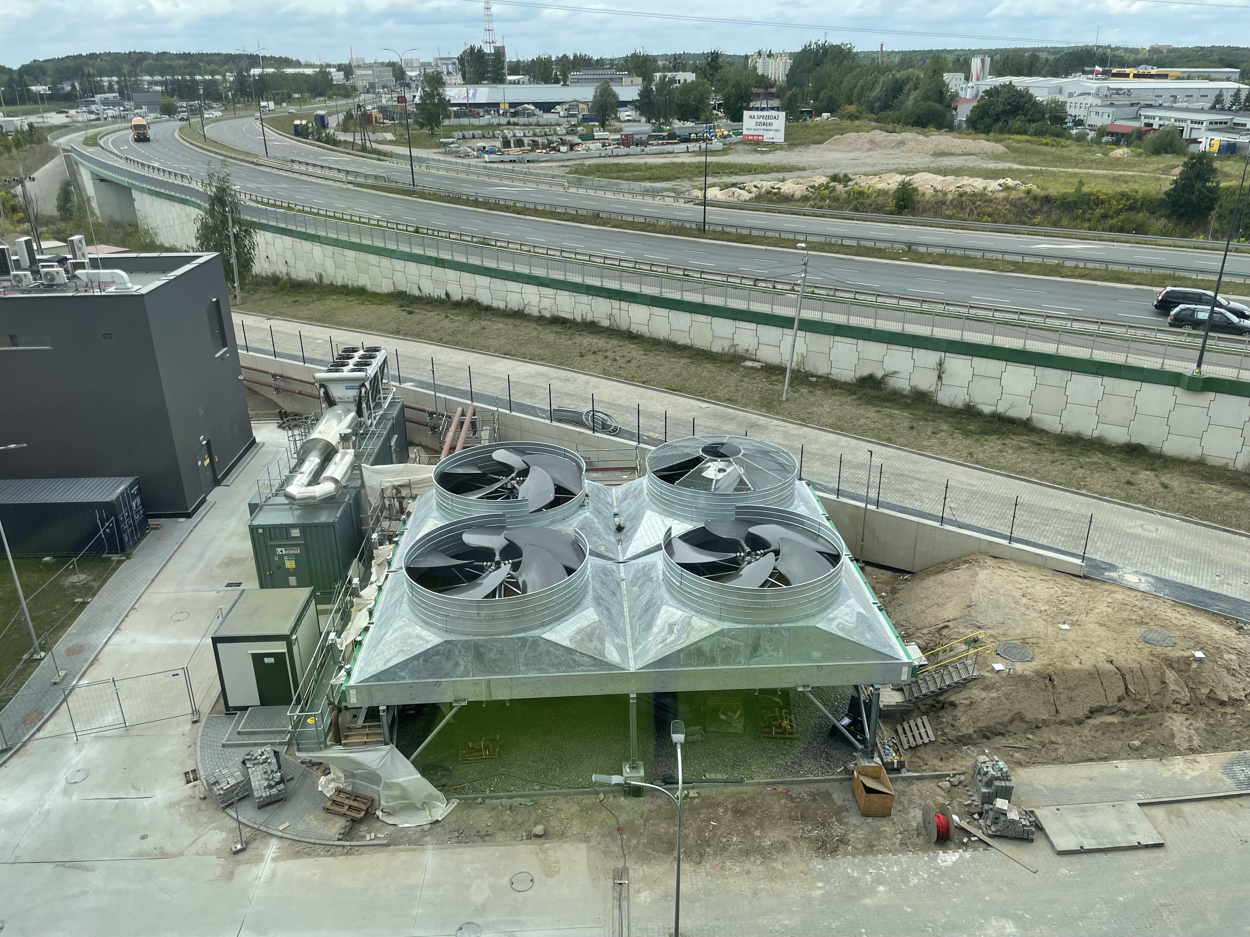 Widok z okien pomieszczenia sterowni (miejsce zarządzania całą instalacją) na chłodnice wody sieciowej, dzięki której nawet w upalne dni Instalacja będzie mogła pracować z pełną mocą wytwarzając ciepło i energię elektryczną. Na drugim tle widoczna część kotłowni szczytowej.