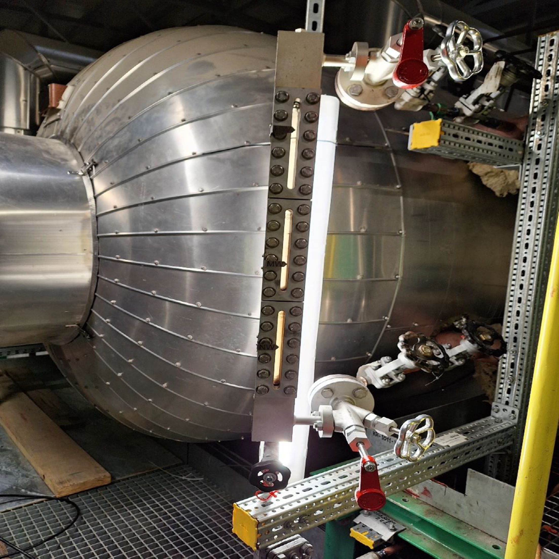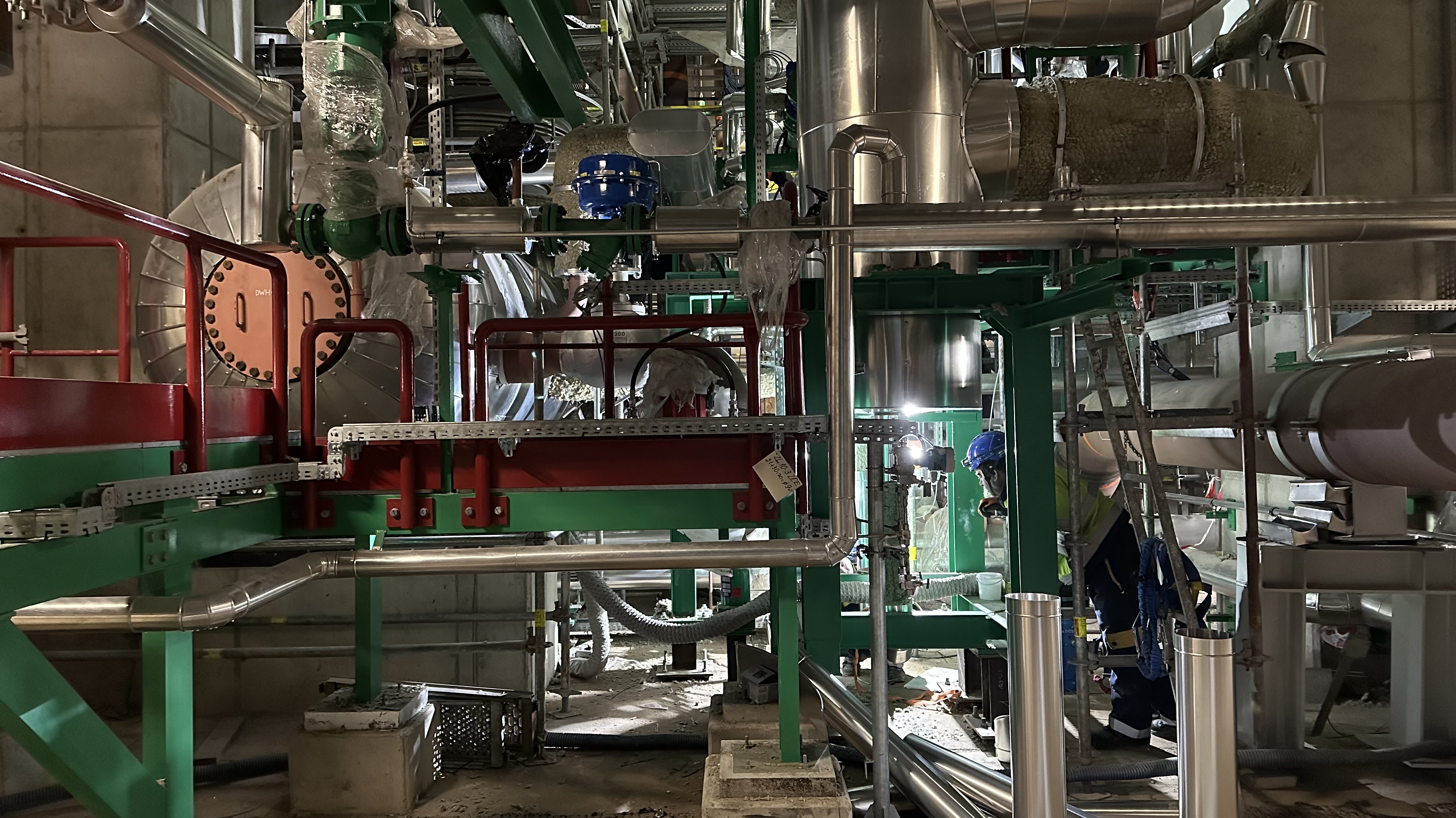 Turbozespół po demontażu tymczasowego rurociągu wydmuchowego – zakończono proces w nomenklaturze branżowej nazywany „dmuchaniem kotła”. Polega on na czyszczeniu wnętrza tego kluczowego elementu instalacji z zanieczyszczeń pobudowlanych, poprzez nagły wyrzut pary. Zanieczyszczenia pozostawione wewnątrz kotła i instalacji parowej stanowiłyby duże zagrożenie dla łopatek turbiny.