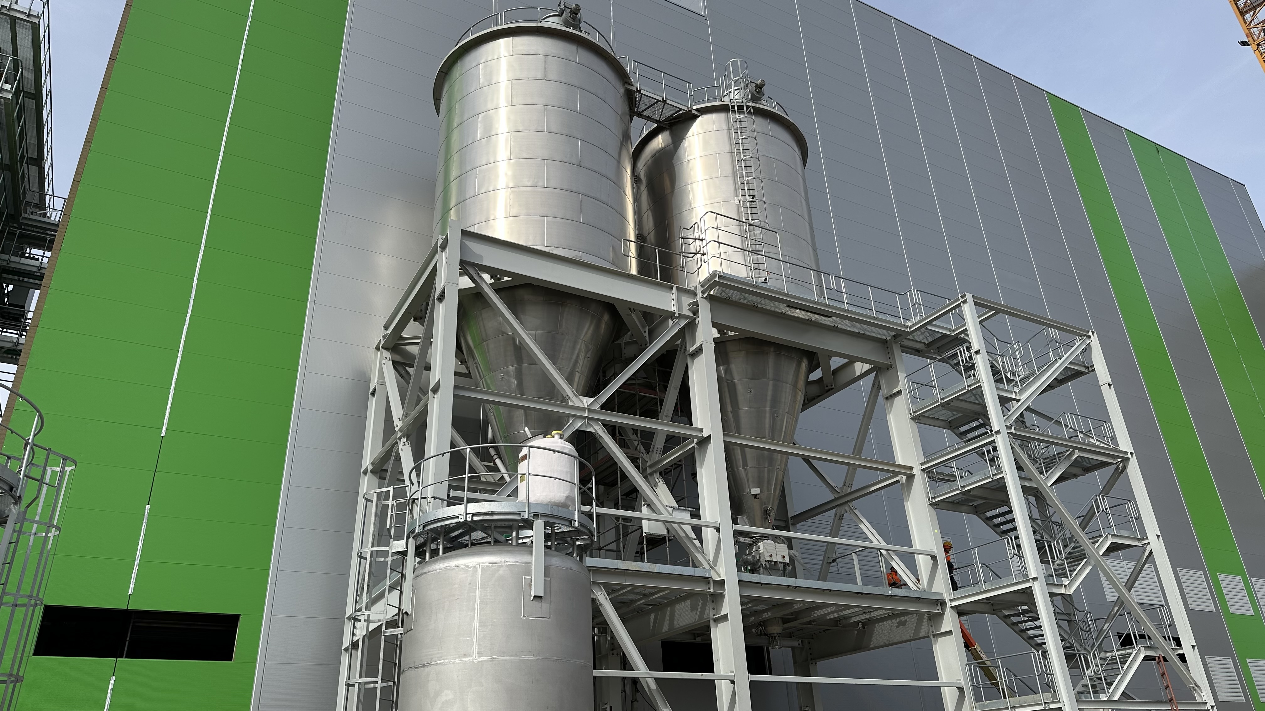 Budowa ITPO. Prace izolacyjne zbiorników silosów pyłów powstających podczas pracy kotła i systemu oczyszczania spalin.