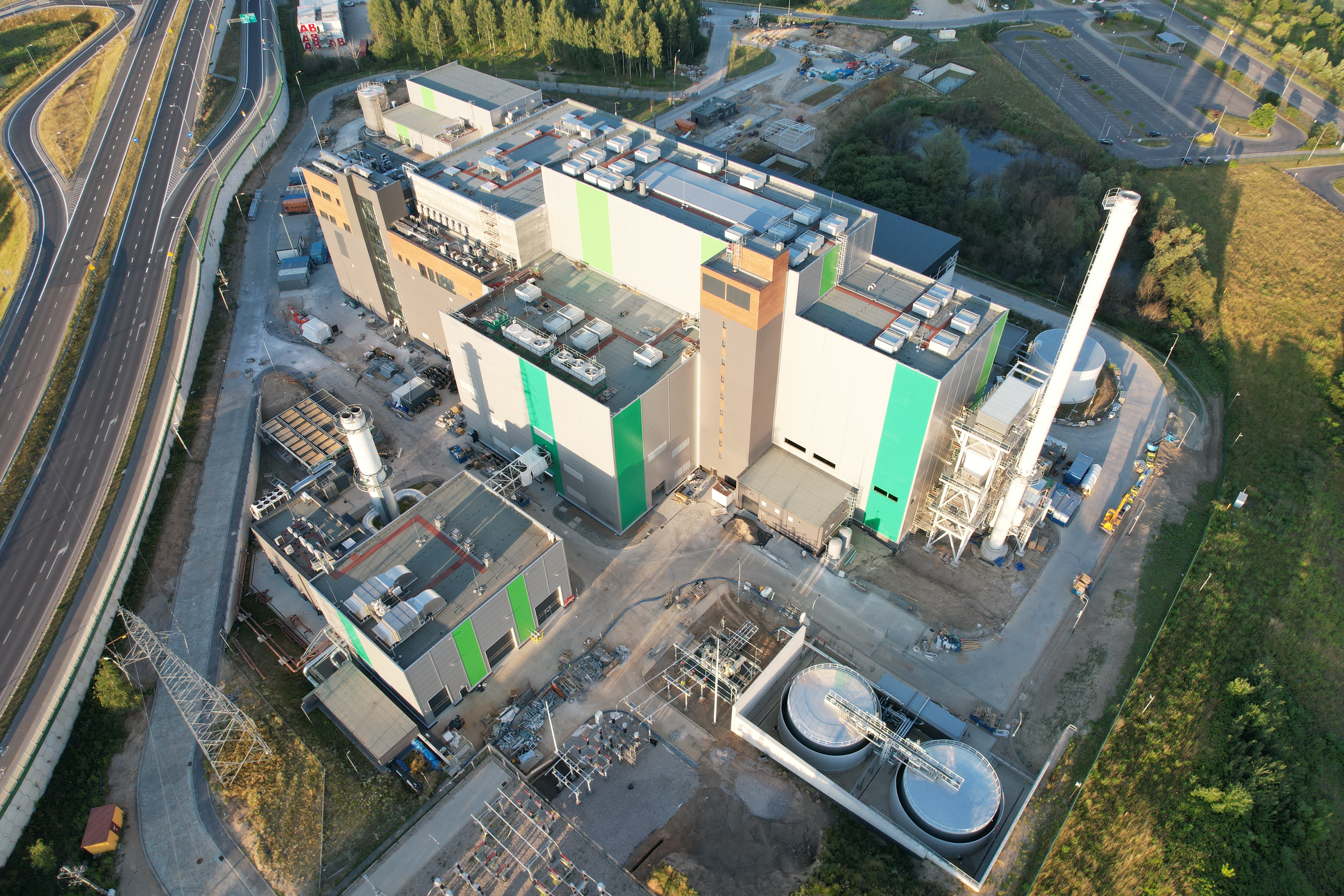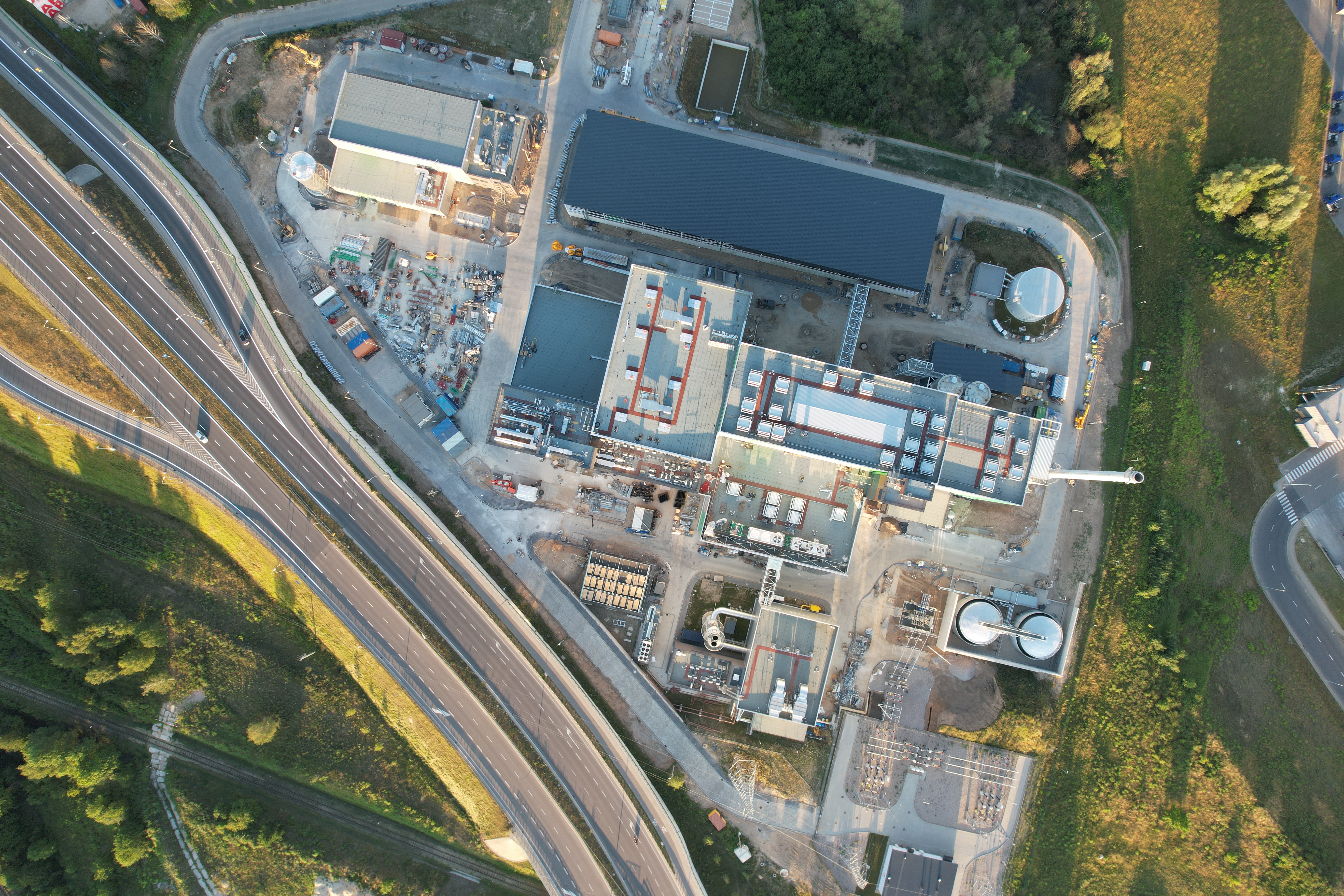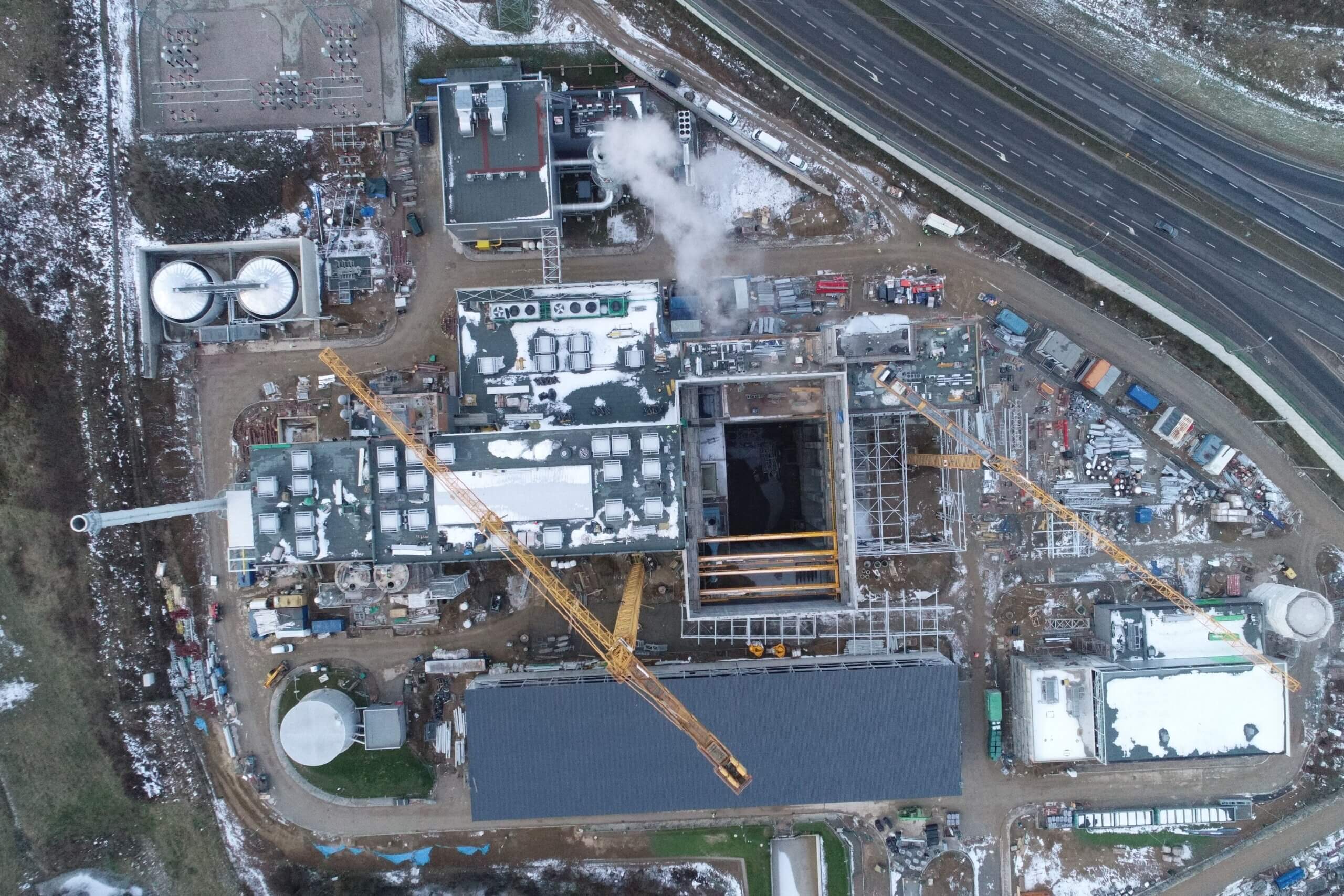 Budowa Instalacji z lotu ptaka, na zdjęciu widoczna jest Kotłownia szczytowa, budynek administracyjno-elektryczny oraz maszynownia z kotłownią.